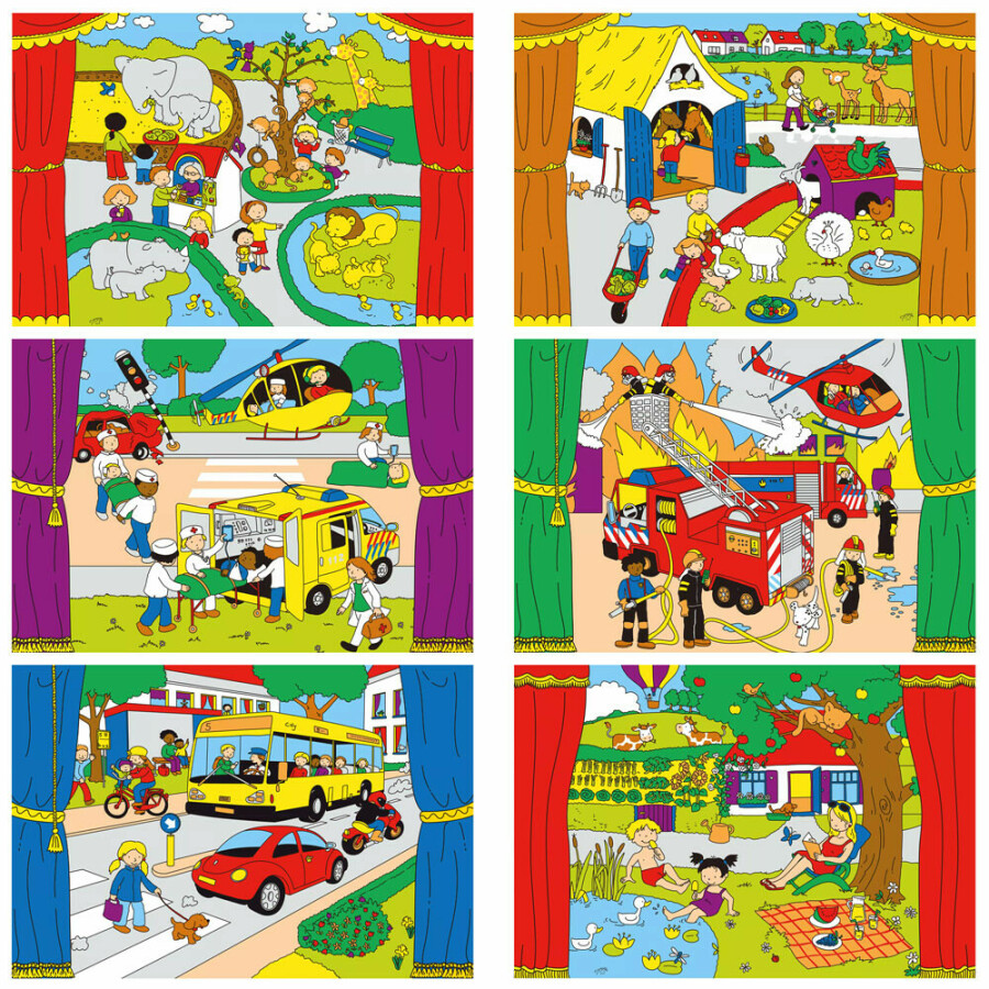 6 dubbelzijdig bedrukte kunststof praatplaten, rond de thema's jaargetijden, recreatie en transport.