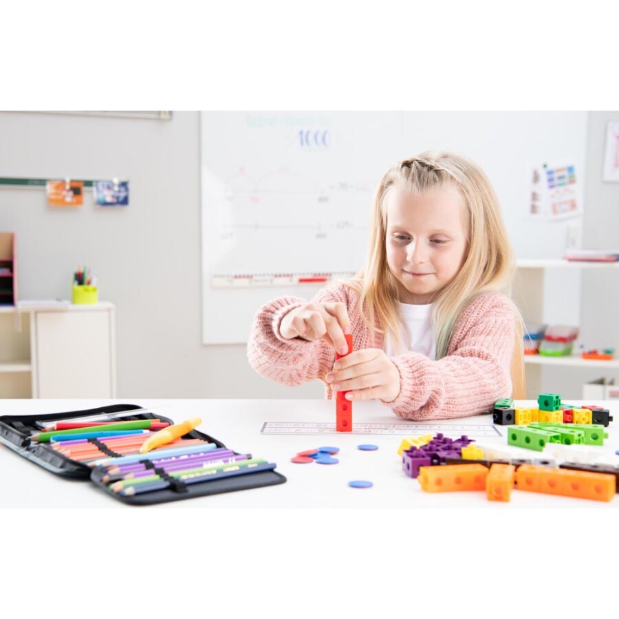De rekenmap met 100 steekblokjes en 22 draaischijven is een complete set voor rekenlessen tot en met 20. Alles zit veilig in een stevige, doorzichtige tas met ritssluiting, zodat je niets kwijtraakt. Met de blokjes kun je makkelijk hoeveelheden vergelijken, sorteren en tellen. De dubbelzijdige rekenstaaf helpt kinderen de getallen van 1 tot 20 te verkennen, waarbij de draaischijven ideaal zijn voor het leren van optellen en aftrekken. Deze set is perfect voor de eerste rekenlessen en traint ook de fijne motoriek van de kinderen.