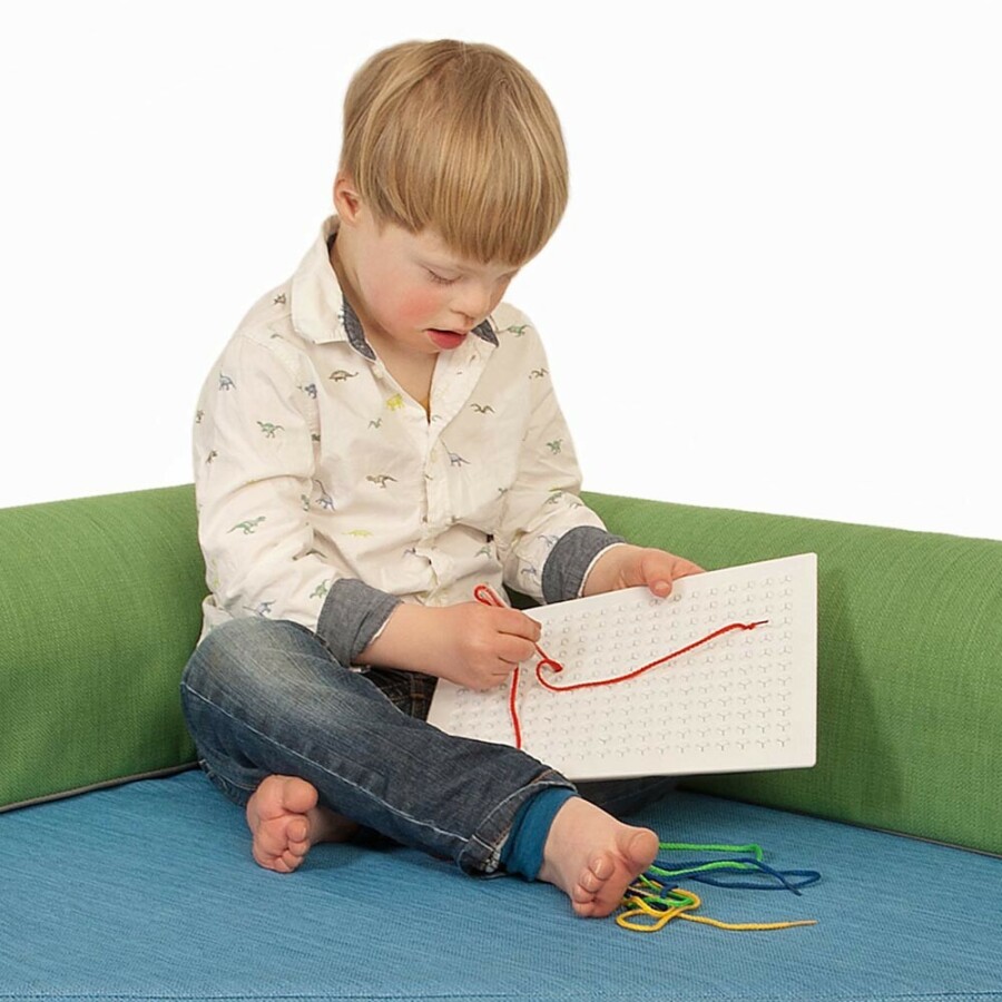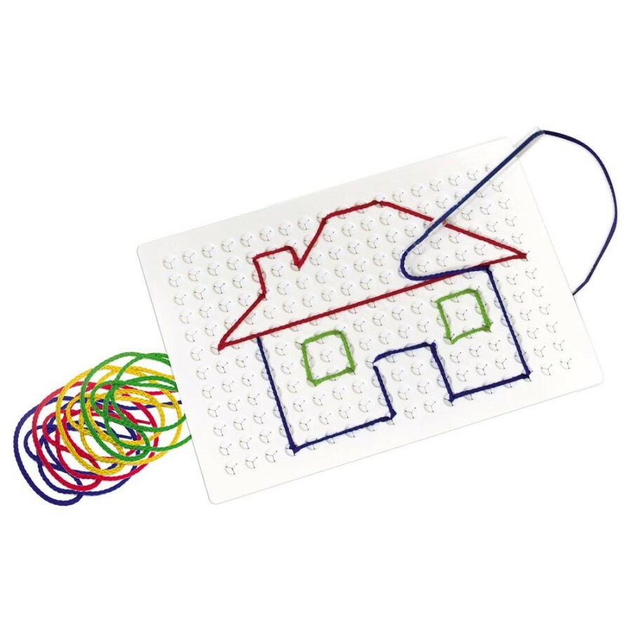 Met dit stevige rijgbord oefenen kinderen polsbewegingen, nauwkeurigheid en de driepuntgreep. Ze rijgen met de pen of met het verstevigde koorduiteinde door de flexibele gaatjes. Zo ontstaan lijnen en figuren, van eenvoudige vormen tot echte mini kunstwerken. Het formaat ligt prettig op tafel en is meteen inzetbaar. Perfect voor rustig werken in hoeken of aan de instructietafel.