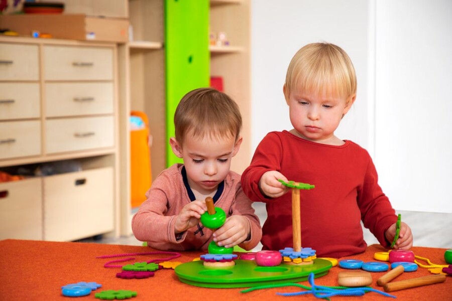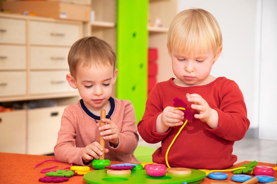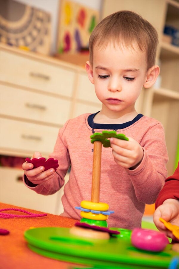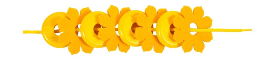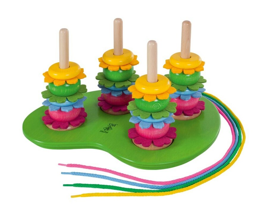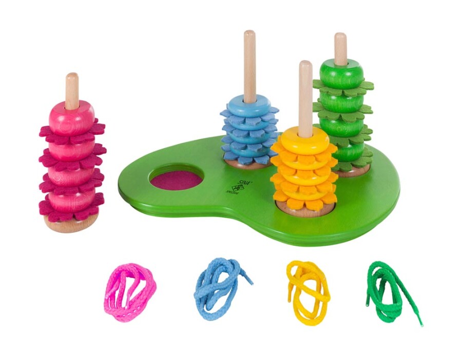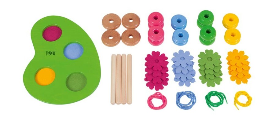 Steken, rijgen, stapelen en sorteren: dit kleurrijke spelmateriaal nodigt direct uit. Kinderen oefenen grijpen, tellen en patronen maken met schijven en zachte bloemen. De basisplaat met staafjes houdt alles overzichtelijk op tafel. Kleuren passen bij elkaar en stimuleren rustige concentratie. Touwtjes en open vormen helpen bij het rijgen en oriënteren.