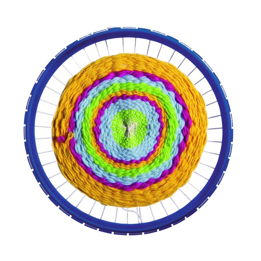 Rond weven is overzichtelijk en rustgevend, met een resultaat dat meteen gebruikt kan worden. Span de draden in de inkepingen en weef met de stompe naald of met de hand. Geschikt voor wol, textielgaren, kralen of natuurvondsten uit het bos. Het blauwe frame is stevig en herbruikbaar, de tas houdt alles bij elkaar. Perfect voor onderzetters, kleine kunstwerken en cadeaus.