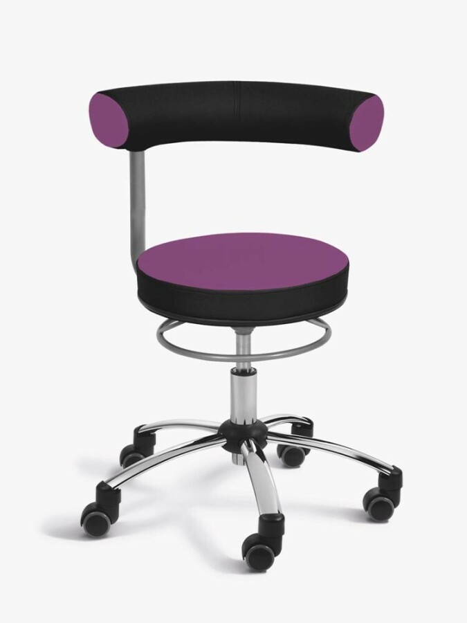 In de klas of thuis ondersteunt deze actieve stoel een natuurlijke, afwisselende zithouding. De 360° steun fungeert als rugleuning, zijsteun of steunpunt naar wens. Verstellen gaat vlot via de ronde ring, met een bereik van 41 tot 52 centimeter. De ronde zitting heeft een sterke kern en paars kunstleer dat je zo afneemt. Geleverd per stuk, draagvermogen 110 kilo; basisdiameter 56 centimeter.
