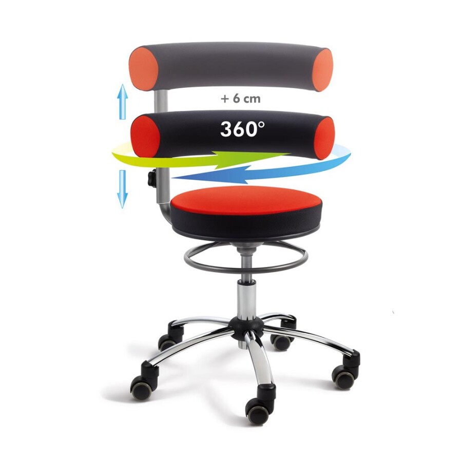 Bewegen tijdens het zitten helpt kinderen focussen en ontlast de rug van volwassenen. Deze stoel heeft een 360° draaibare, verstelbare rugleuning voor steun aan elke kant. De zithoogte stel je eenvoudig met de ronde bedieningsring in, van 41 tot 52 cm. De ronde zitting met stevige vulling zit comfortabel tijdens les, huiswerk of therapie. Het kunstleer veeg je snel schoon. Geschikt voor leerlingen vanaf 6 jaar en ook voor volwassenen, tot 110 kg.