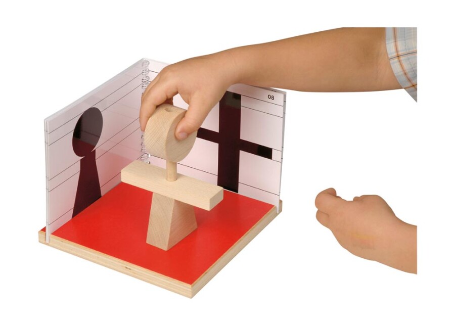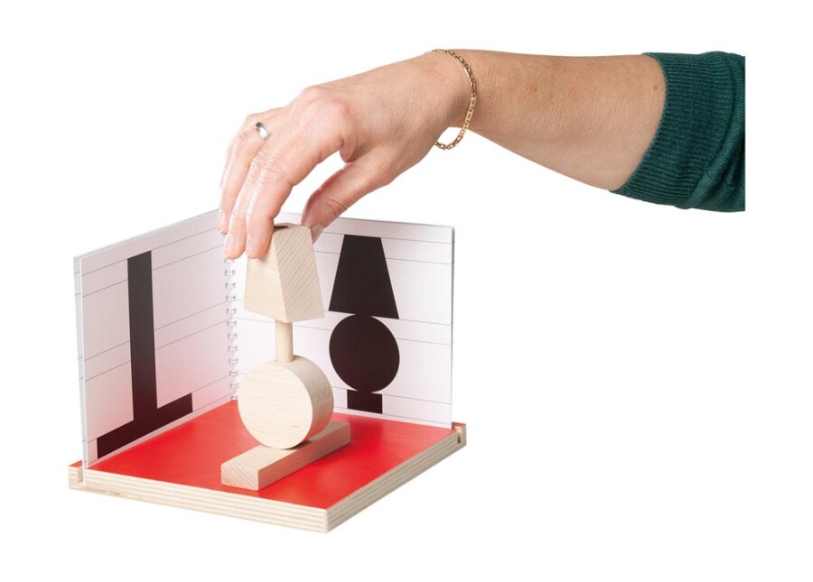 Met deze basisset oefenen kinderen het precies plaatsen van vormen op een stok. Doel is dat beide schaduwen overeenkomen met het voorbeeld. De kaarten zijn op ware grootte. Dat helpt bij zelfstandig werken.
