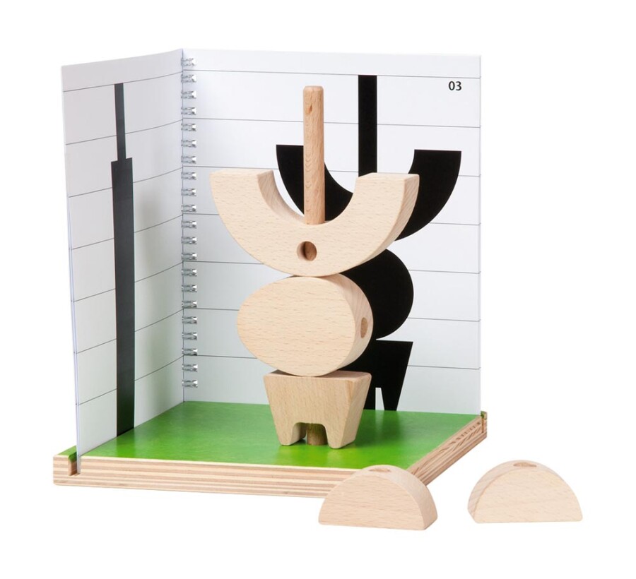 - Inhoud: grondplaat, rondstok, 2 halve cilinders, eivorm, trapezium, halve ring, voorbeeldboekje