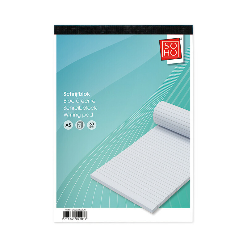 Het SOHO Schrijfblok A5 met lijnen is ideaal voor al je notities. Het schrijfblok heeft een handig A5-formaat van 21x14,8 cm en bevat 100 gelinieerde vellen. Perfect voor thuis, op kantoor of onderweg.