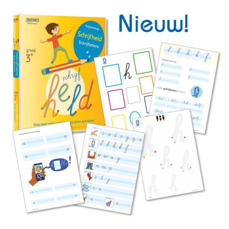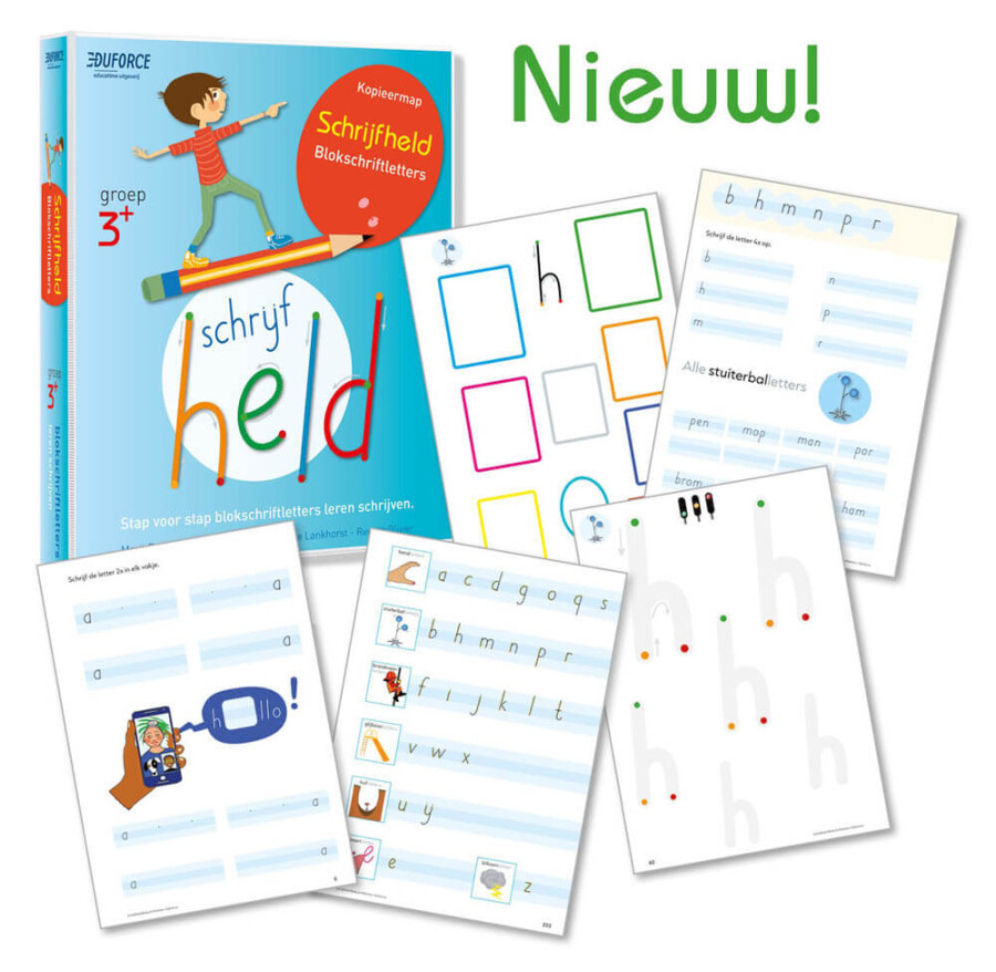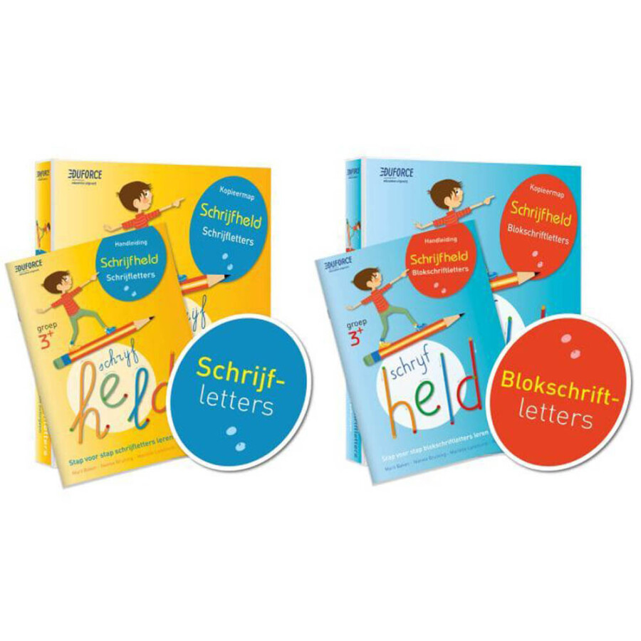 Het Schrijfheld Duo-pakket bestaat uit twee kopieermappen: Schrijfletters en Blokschriftletters. Samen vormen ze een compleet pakket met per letter praktische, opbouwende schrijfoefeningen. De mappen zijn flexibel in te zetten naast de reguliere schrijfmethode en worden geleverd met een duidelijke handleiding voor de begeleider.