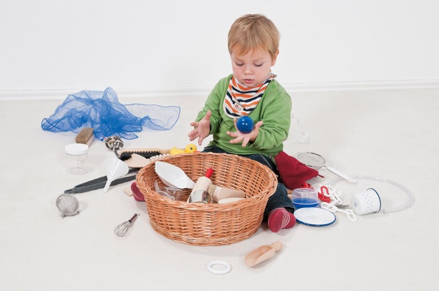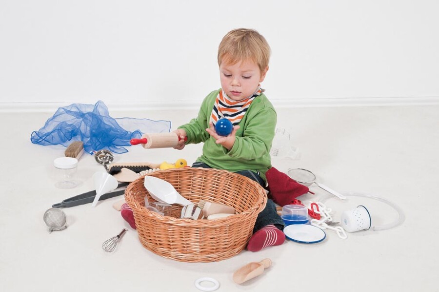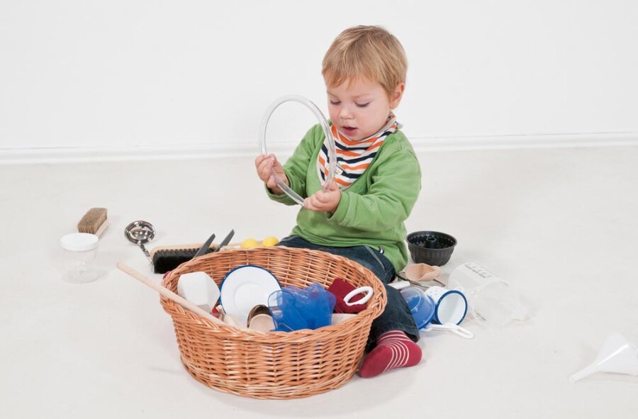 Een mand vol vertrouwde gebruiksvoorwerpen prikkelt nieuwsgierigheid en zintuigen bij peuters en dreumesen. Kinderen onderzoeken, voelen en vergelijken, terwijl jij woorden geeft aan wat ze doen. Gebruik altijd begeleiding en laat de inhoud variëren voor nieuwe ontdekkingen.