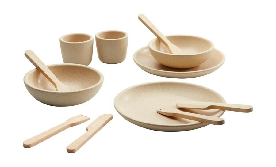Duurzaam houten servies voor rollenspel in de huishoek of peuterspeelzaal. Vervaardigd uit het hout van afgedankte rubberbomen. Glad afgewerkt en prettig in kleine handen. Compleet voor twee kinderen aan tafel.
