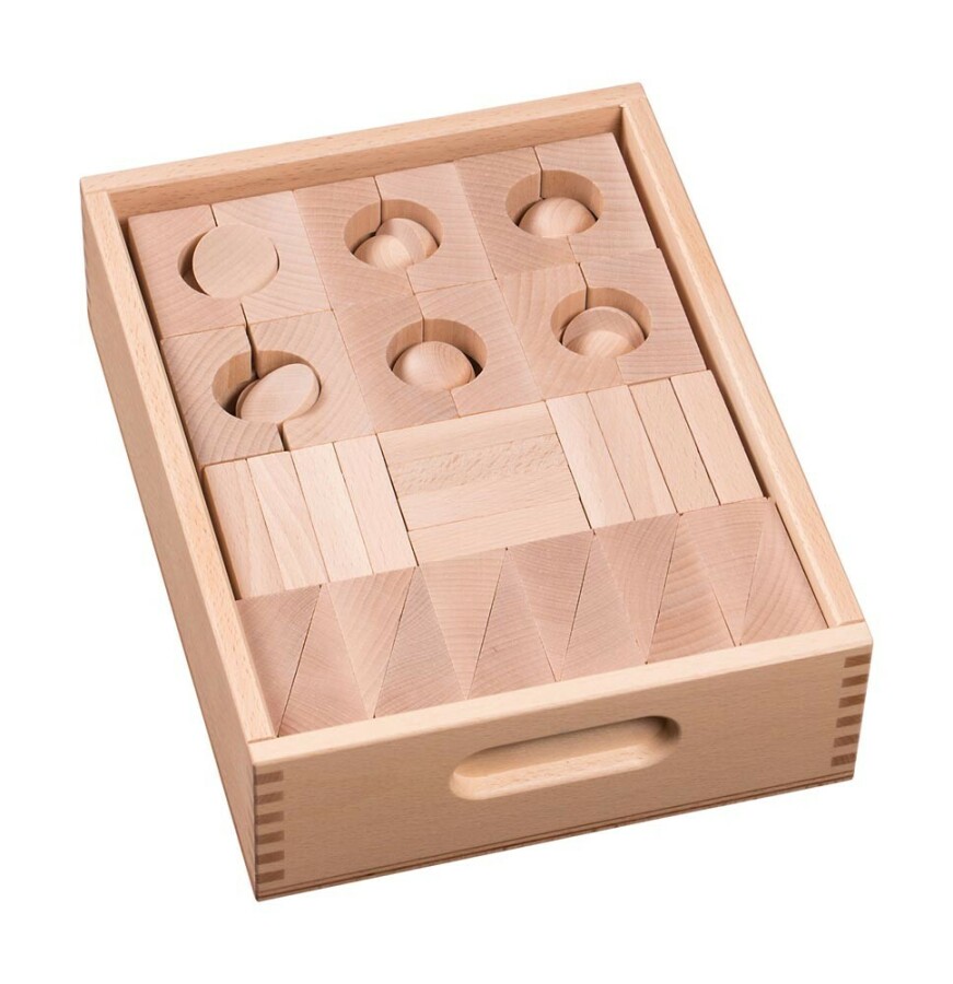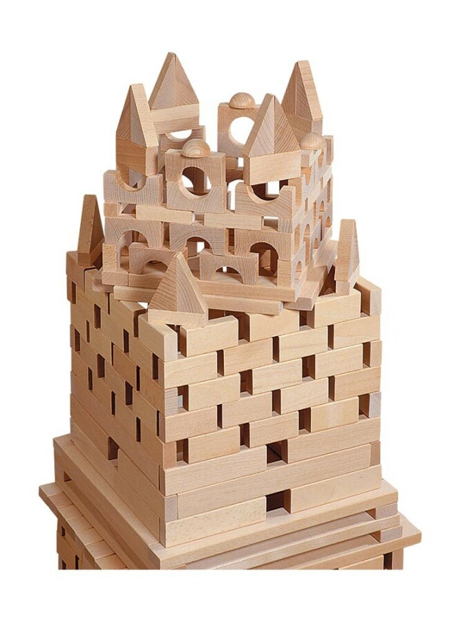Deze set voegt kolommen, bollen en halfronden toe voor echte sierdetails. Kinderen bouwen poorten, bruggen en paleisingangen met naturel beukenhout. De kist houdt de vele onderdelen overzichtelijk, ook in de klas. Sluit aan op andere sets in dezelfde maat.