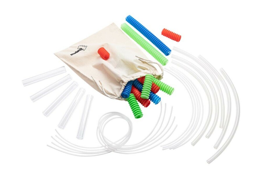 Geef peuters en kleuters echt onderzoeksmateriaal: stevige slangen die je kunt rollen, buigen, koppelen en vergelijken. Kinderen voelen, horen en zien wat er gebeurt bij het manipuleren. Het spel nodigt uit tot combineren, vullen, rijgen en bouwen. Een duurzame bewaartas maakt opruimen eenvoudig.