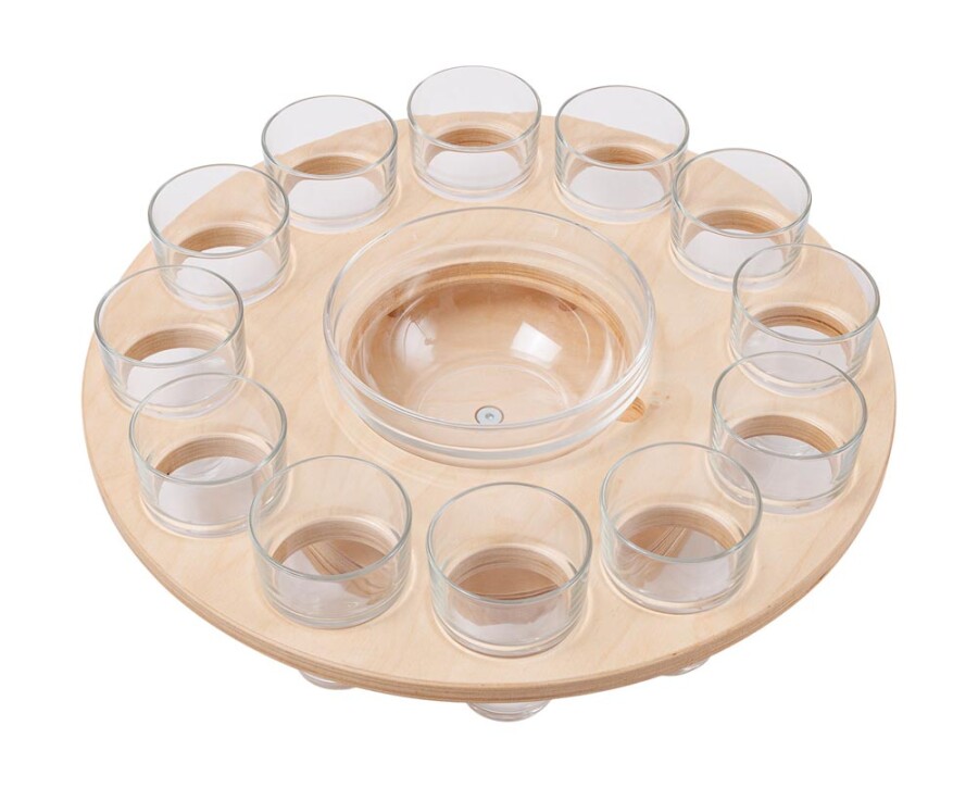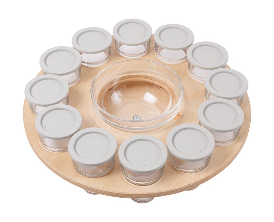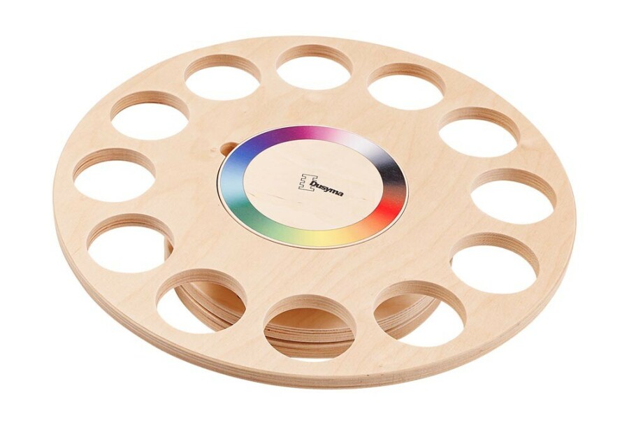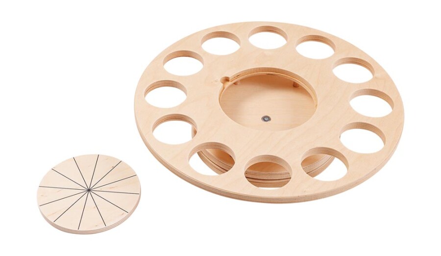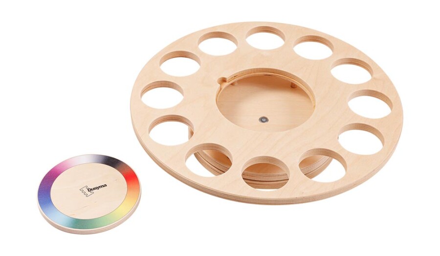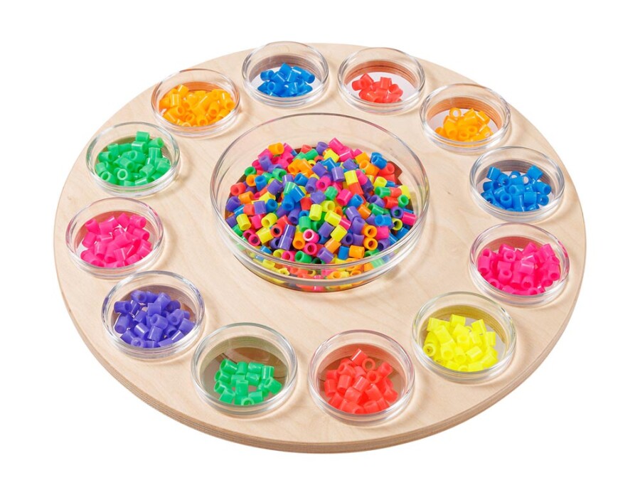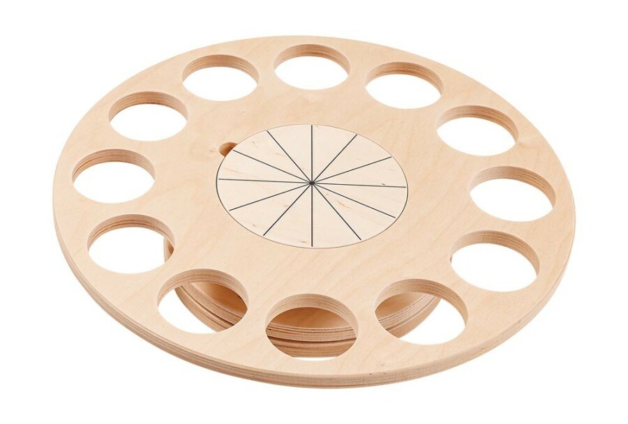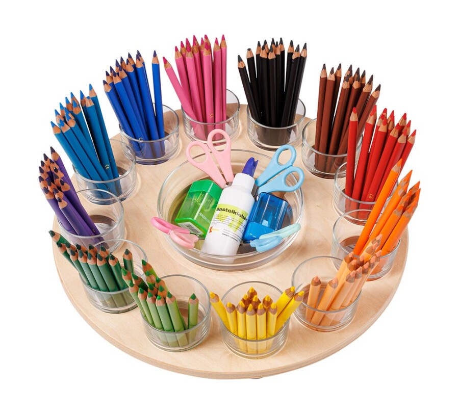 Deze houten draaicarrousel houdt materiaal overzichtelijk en nodigt uit tot sorteren. De uitneembare schijf heeft twee kanten: kleurverloop of twaalf gelijke vakken. Kinderen ordenen potloden, losse onderdelen en schatten zelfstandig. De draaiende beweging stimuleert autonomie en gezamenlijk opruimen.