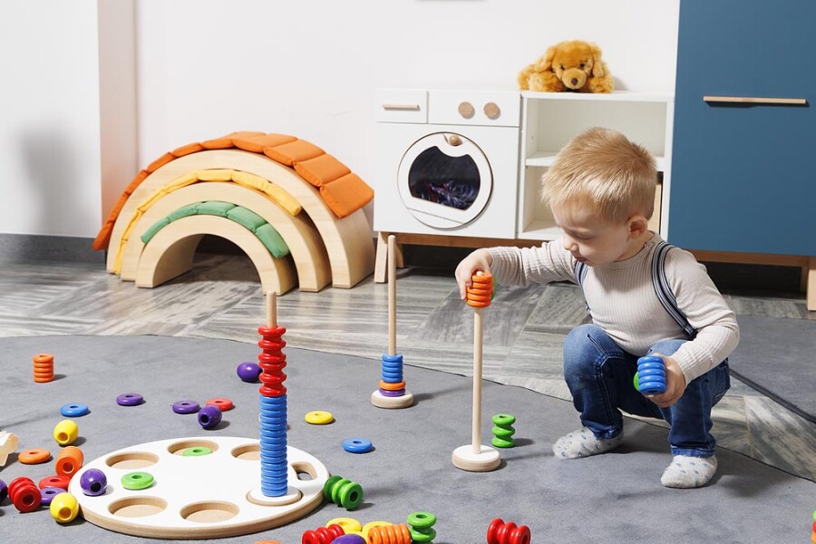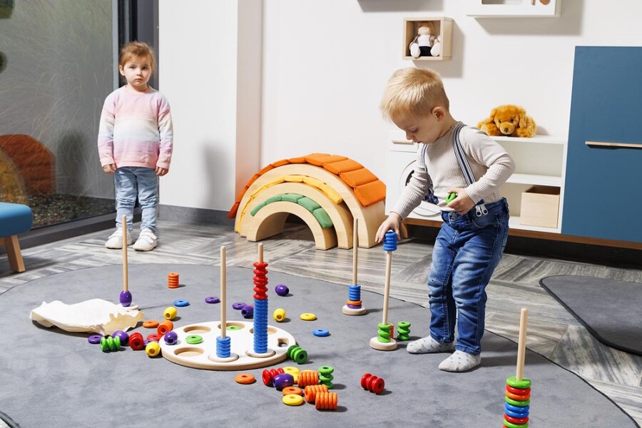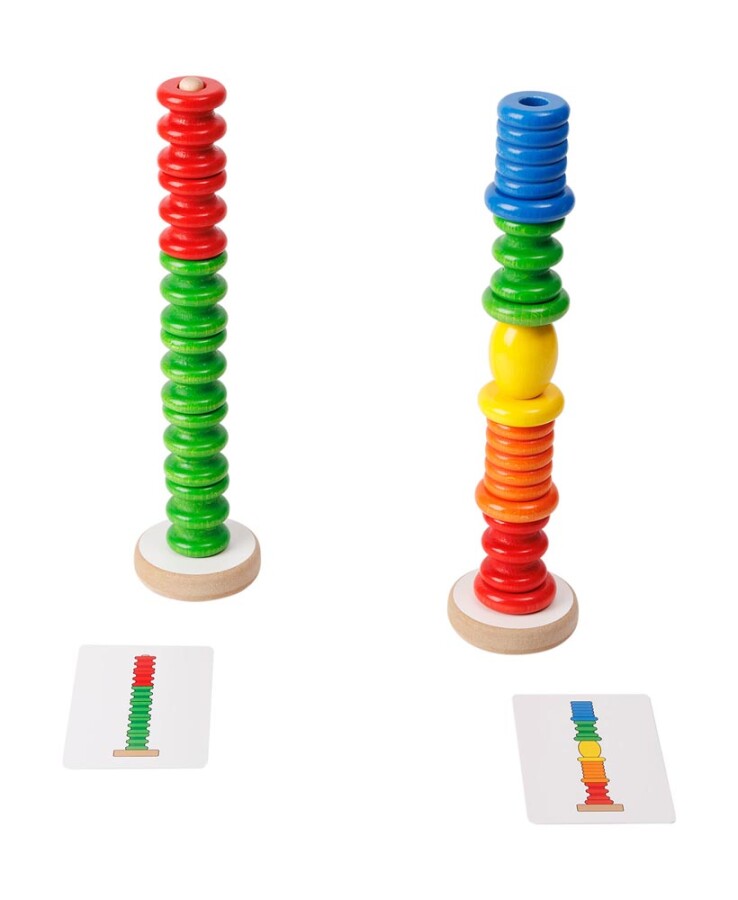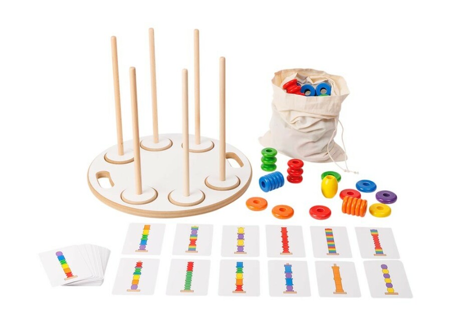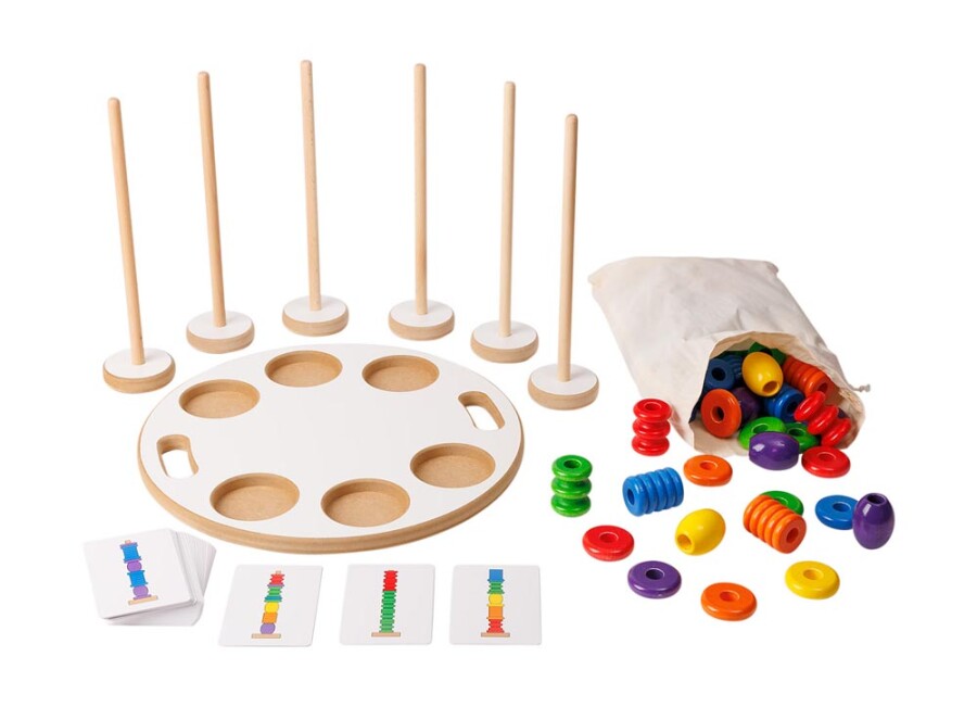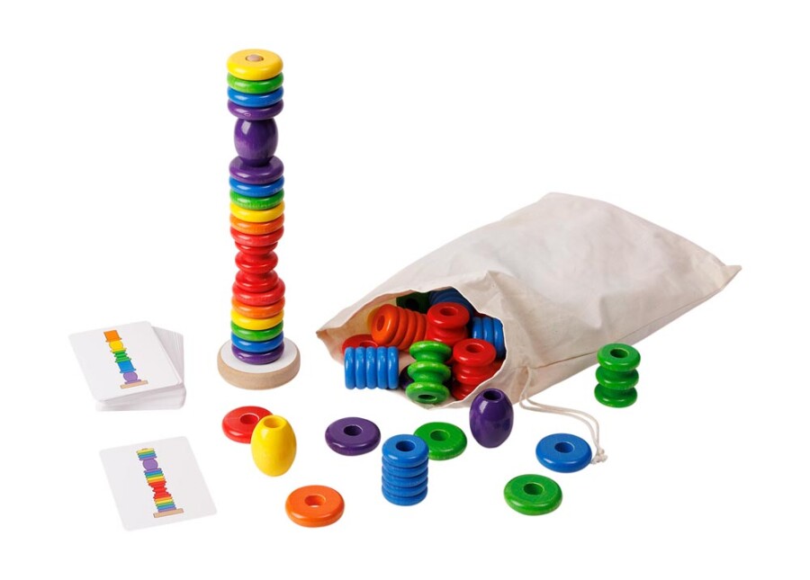 Stapelen, benoemen en vergelijken in één rijk sorteerspel. Geef taalprikkels terwijl kinderen kleuren, vormen en volgorde bespreken. Volg voorbeeldkaarten of maak eigen reeksen op de hoge torens. Ideaal voor woordenschat, tellen en logisch denken. Duurzaam hout, fijn in de hand.