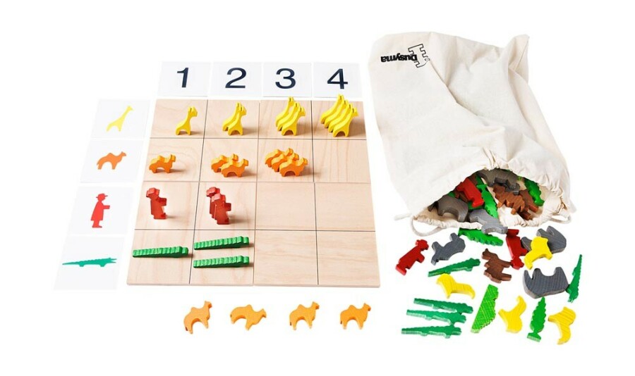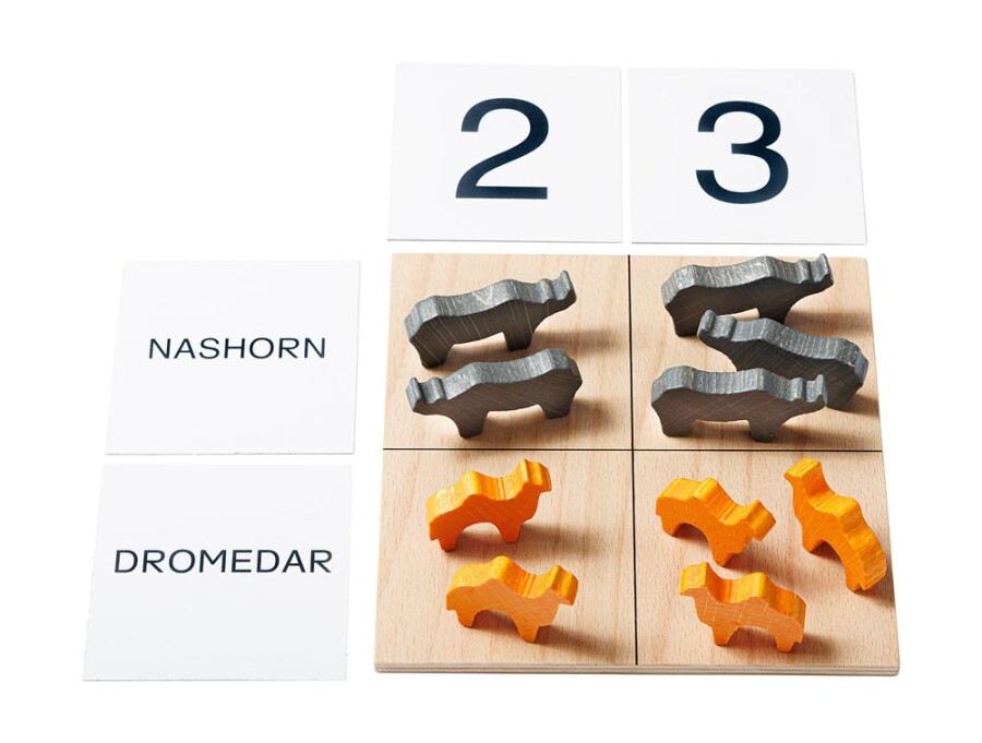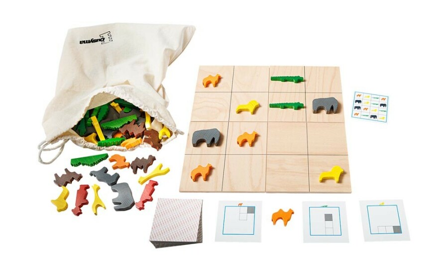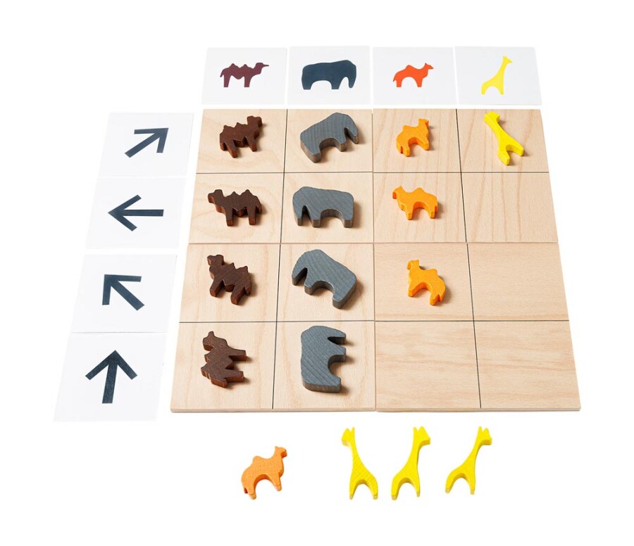Met kleurrijke houten dieren en kaarten oefenen kinderen patronen, volgordes en posities. De opdrachten variëren van eenvoudig rangschikken tot coördinaten lezen, met zelfcontrole via oplossingskaarten. Antislipnoppen houden de bordjes netjes op hun plek. Geschikt voor taal, rekenen en logisch denken in klas en therapie.