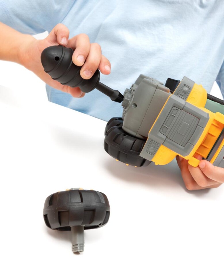 Vijf stevige bouwvoertuigen voor eindeloos construeren en repareren. Elk voertuig rolt soepel en heeft een bewegend onderdeel, zoals bak of trommel. Met de meegeleverde schroevendraaier kunnen kinderen onderdelen loshalen. Dat is leuk en leerzaam voor techniekgevoel en fijne motoriek. Ideaal voor groepjes die samen een bouwplaats willen spelen.