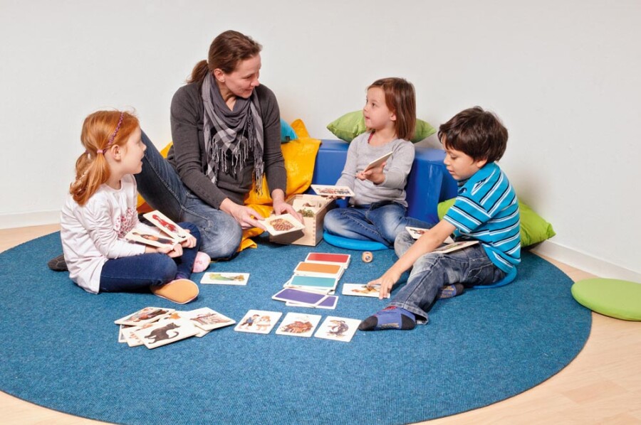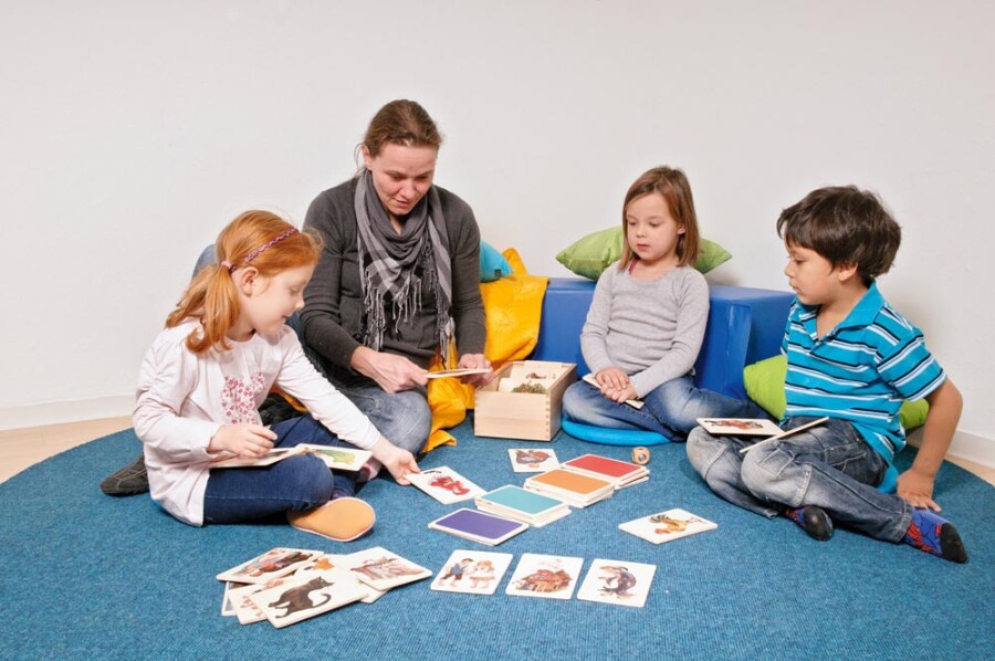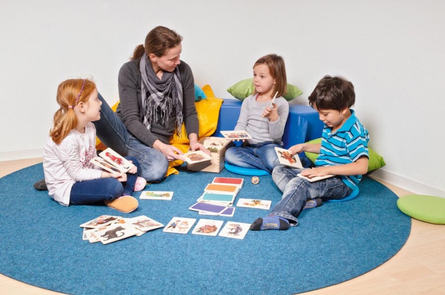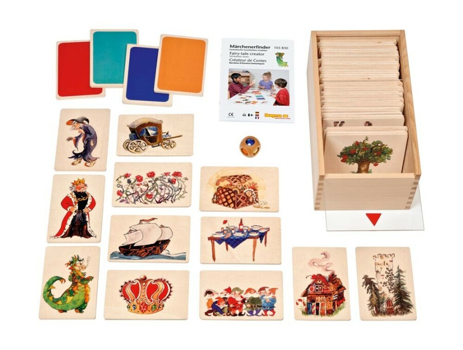 Houten sprookjeskaarten prikkelen fantasie en taal. Kinderen bedenken verhalen en vertellen klassiekers na met steun van de afbeeldingen. Kleuren op de achterkant ordenen personen, plekken, dingen en dieren. De meegeleverde dobbelsteen nodigt uit tot spelvariaties.