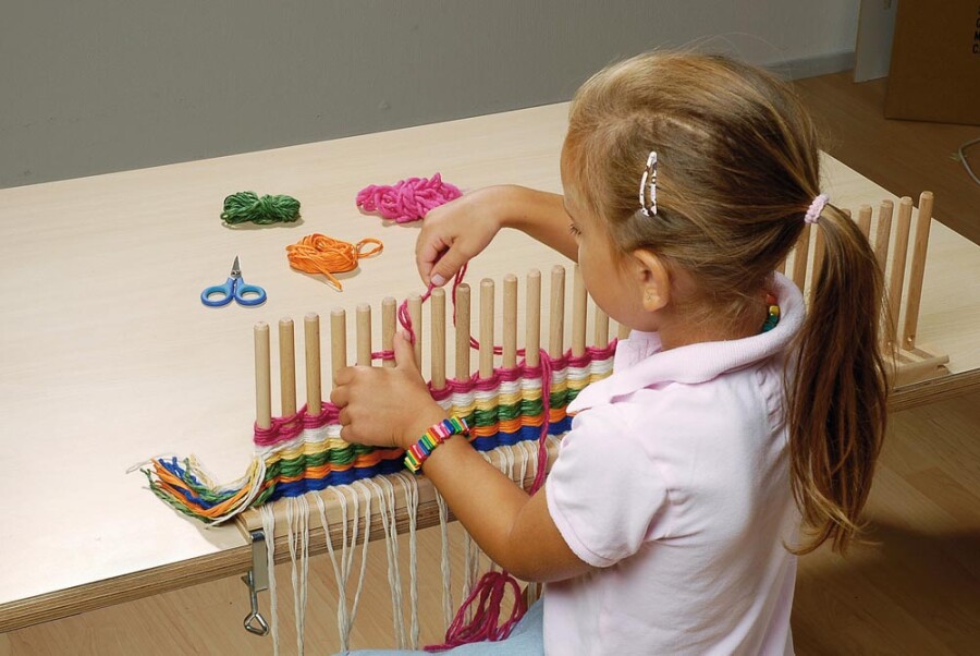 Met dit extra brede weefraam werk je fijn met groepen en beginnende wevers. Klem het snel en stevig aan de tafel met twee schroefklemmen. Geschikt voor kleedjes, lopers, wanddecoraties, kussens en tasprojecten. De staven geven duidelijke structuur en ondersteunen het leerproces.