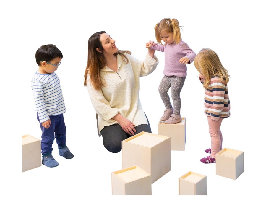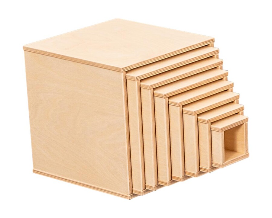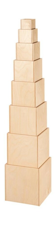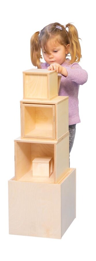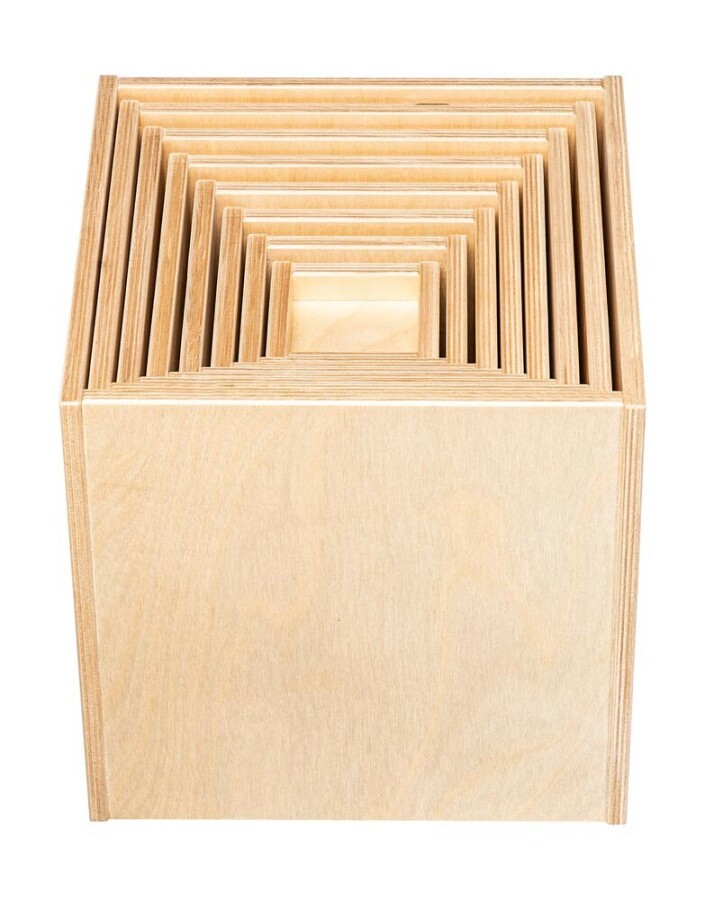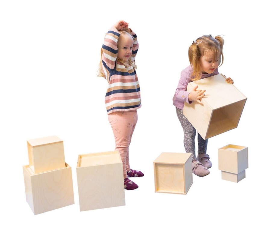 Grote, stevige houten kubussen om torens te bouwen, te zitten of rollenspel vorm te geven. De ingeÂgroefde bodems zorgen voor stabiel stapelen en gevarieerde bouwwerken. Combineer met andere blokken of gebruik ze als poppenhuis in de speelhoek.