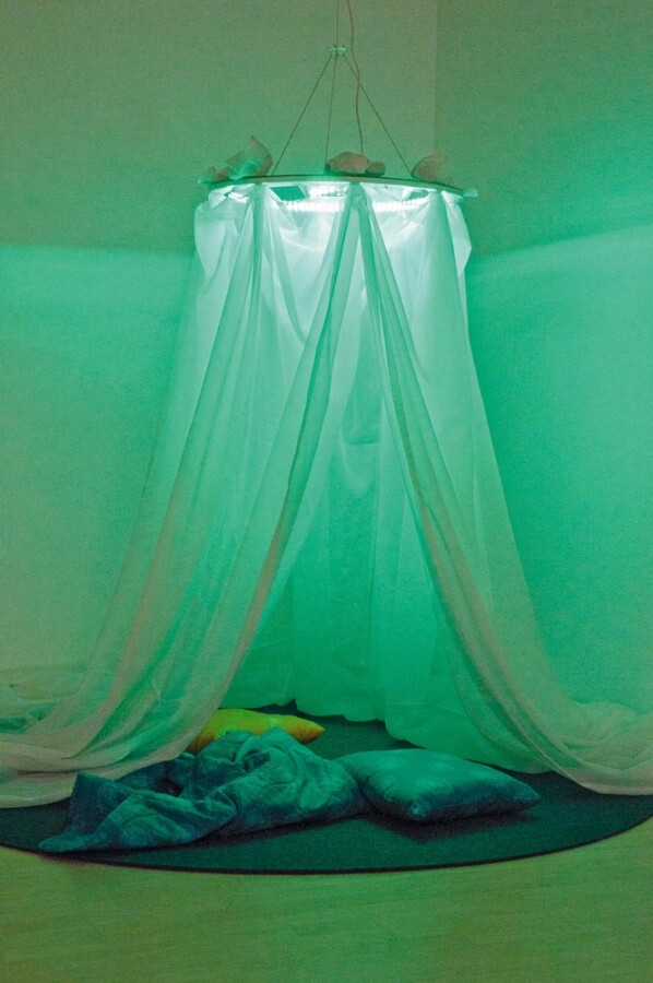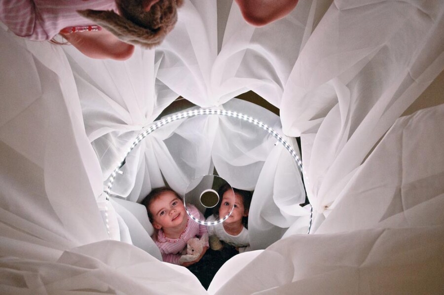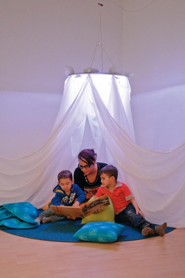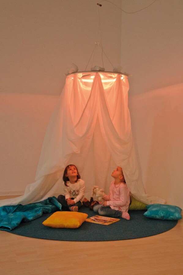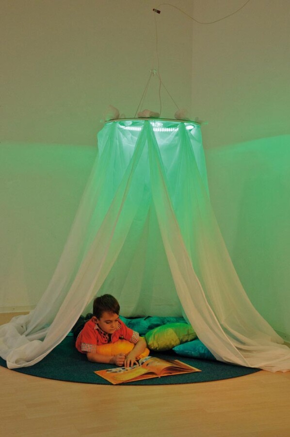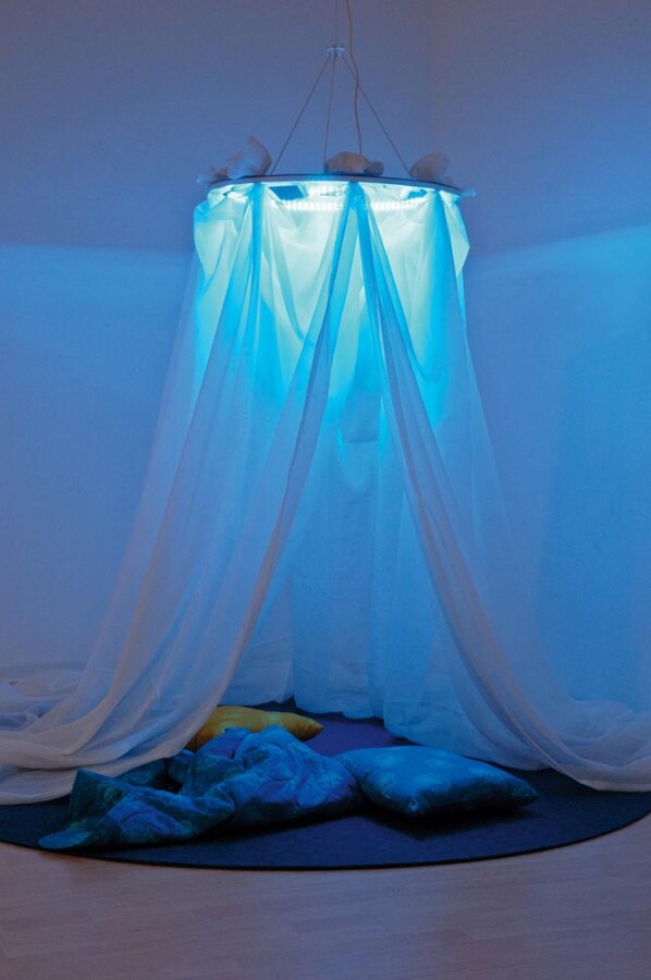 Een spiegelende sterrenhemel kleurt de ruimte en zorgt voor rust en verwondering. Met de meegeleverde baldakijnstof en steekschijven maak je eenvoudig jouw eigen sfeer. De schijven laten bij belasting los, dus veilig boven speelhoek of leesplek. Ideaal voor snoezelen, prikkelarme momenten en mooi decor in de klas.
