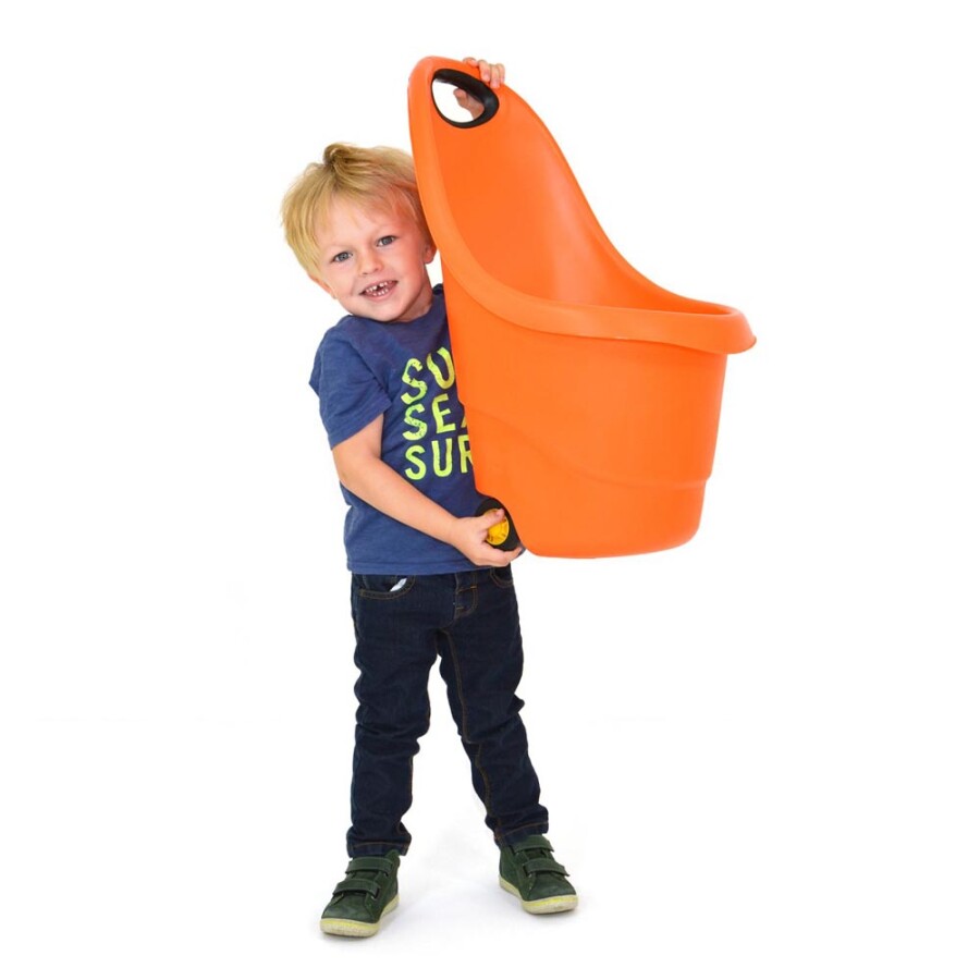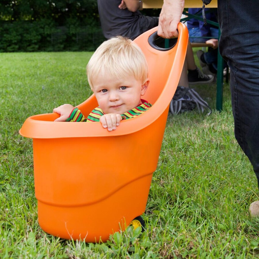 Met deze lichte trolley verplaatsen kinderen speelgoed en materialen zonder moeite. Het stevige kunststof kan tegen weer en wind. Volrubberen wielen rollen soepel en geven goede grip. De smalle basis blijft toch stabiel bij stilzetten. Handig bij opruimen, rollenspel en verzameltochten.