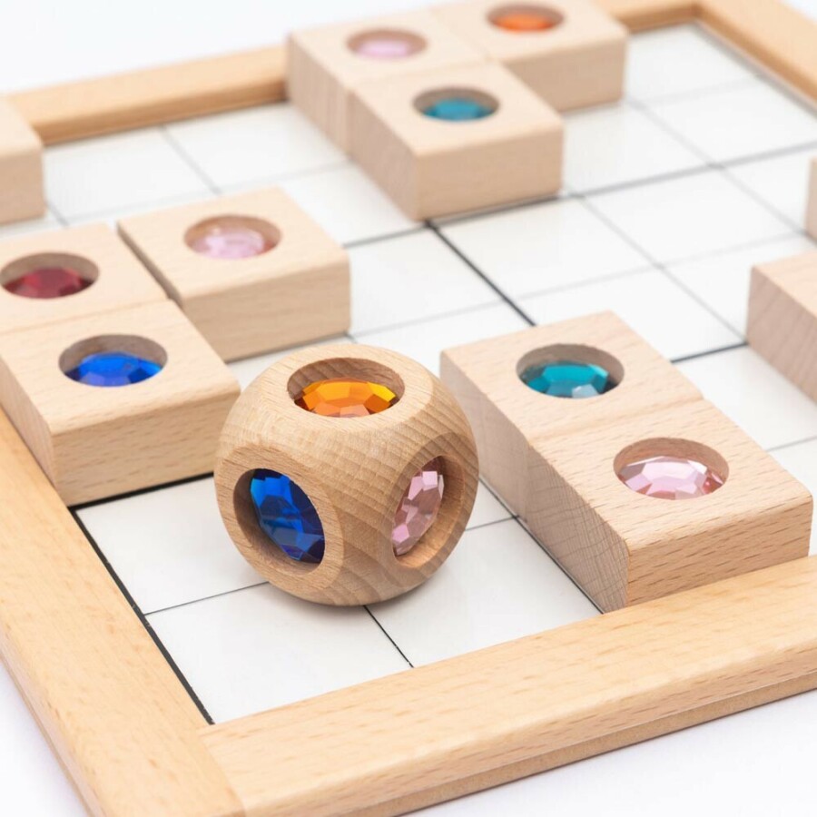 Een mooi denkspel dat meteen uitnodigt door de glinsterende stenen en het houten bord. Plaats de 36 juwelen volgens het raster en kies een spelvariant die past bij de groep. Van vrij leggen tot echte strategie, je kunt het zo eenvoudig of uitdagend maken als je wilt. De set is sterk genoeg voor klasgebruik en blijft lang mooi. Met duidelijke uitleg voor verschillende manieren van spelen, voor jong en ouder.
