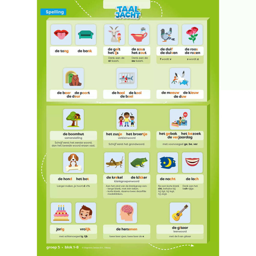 De categoriekaarten van Taaljacht helpen leerlingen uit groep 5 om zich de juiste spelling van woorden eigen te maken. Op de kaarten vinden ze, per categorie, een voorbeeldwoord en een korte uitleg van de spellingregel of -afspraak terug.