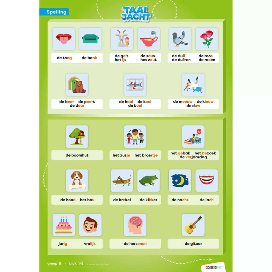 De categorieposter van Taaljacht kan leerlingen uit groep 7 op weg helpen. Op de poster staat, per categorie, een voorbeeldwoord met een korte uitleg over de spellingregel of -afspraak. De leerkracht kan hier naar verwijzen bij het geven van instructie of het nabespreken van dictees.