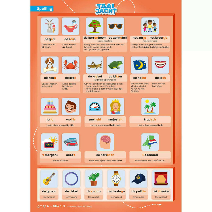 De categoriekaarten van Taaljacht helpen leerlingen uit groep 6 om zich de juiste spelling van woorden eigen te maken. Op de kaarten vinden ze, per categorie, een voorbeeldwoord en een korte uitleg van de spellingregel of -afspraak terug.