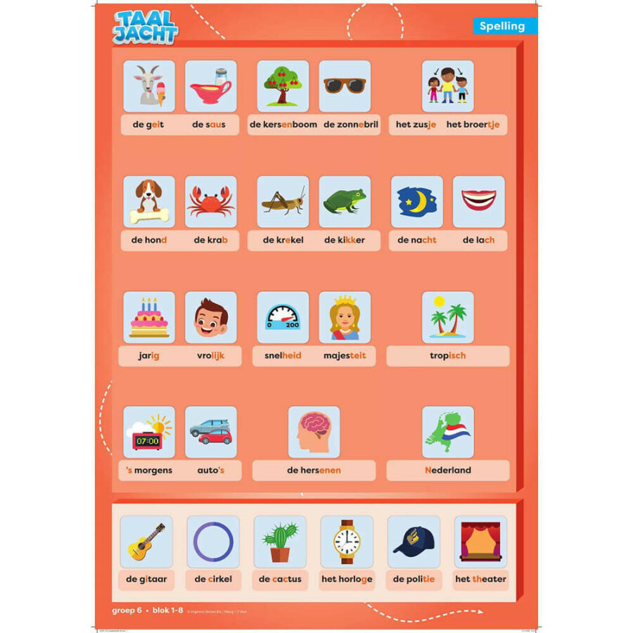 De categorieposter van Taaljacht kan leerlingen uit groep 8 op weg helpen. Op de poster staat, per categorie, een voorbeeldwoord met een korte uitleg over de spellingregel of -afspraak. De leerkracht kan hier naar verwijzen bij het geven van instructie of het nabespreken van dictees.