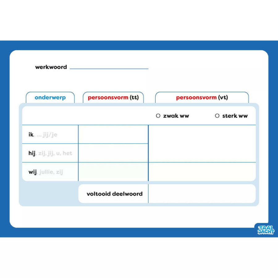 Deze set van 30 wisbordjes zijn onderdeel van de methode Taaljacht voor groep 7 en 8. Aan een kant zijn ze blanco, aan de andere kant voorbedrukt met het werkwoordschema.