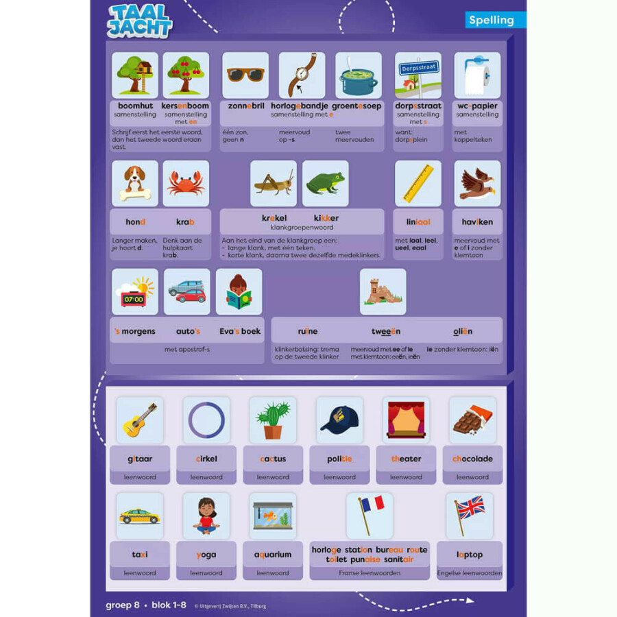 De categoriekaarten van Taaljacht helpen leerlingen uit groep 8 om zich de juiste spelling van woorden eigen te maken. Op de kaarten vinden ze, per categorie, een voorbeeldwoord en een korte uitleg van de spellingregel of -afspraak terug.