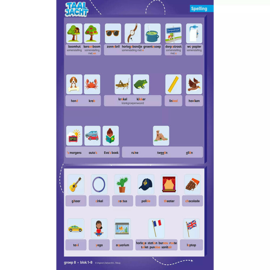 De categorieposter van Taaljacht kan leerlingen uit groep 5 op weg helpen. Op de poster staat, per categorie, een voorbeeldwoord met een korte uitleg over de spellingregel of -afspraak. De leerkracht kan hier naar verwijzen bij het geven van instructie of het nabespreken van dictees.