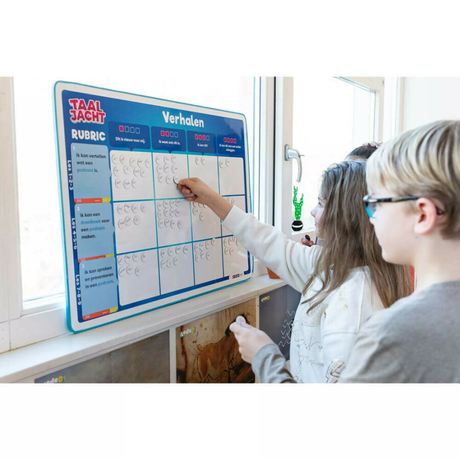 Met dit speciale magneetbord worden de rubrics van elk blok gevisualiseerd in de klas en speelt daarmee een centrale rol. Leerlingen kunnen aangeven waar ze zich bevinden ten opzichte van de leerdoelen van het blok. Dit maakt hun taalontwikkeling inzichtelijk.