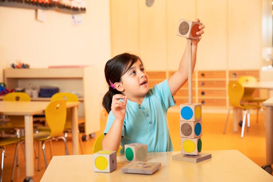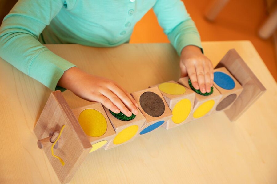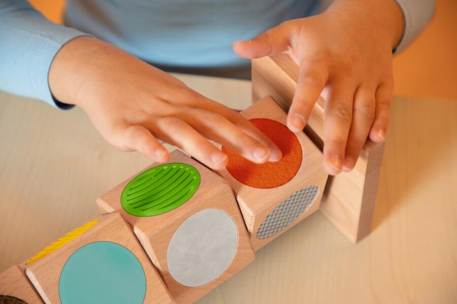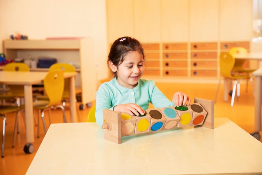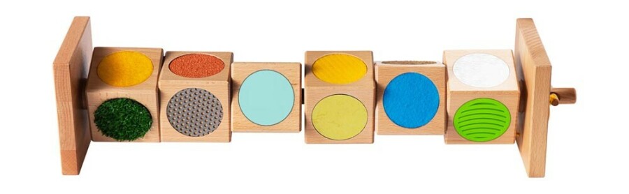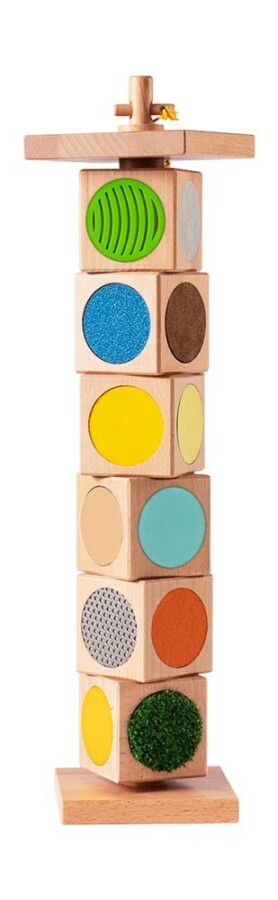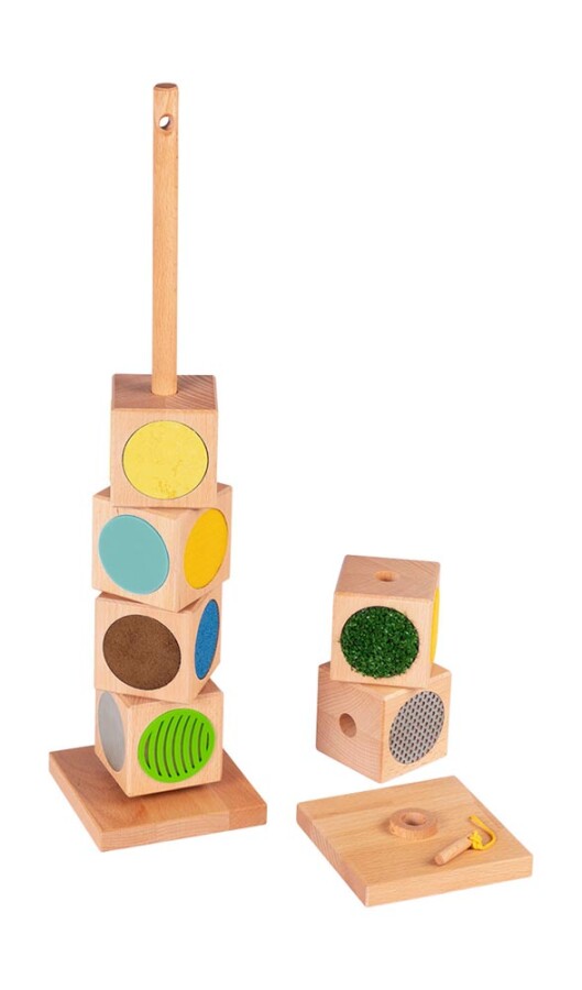 Raak en vergelijk: met deze set oefen je tastgeheugen en concentratie. De zes kubussen hebben op elke zijde een ander materiaal, waardoor paren zoeken op gevoel wordt. Draai aan de kubussen of haal ze uit de houder voor nieuwe spelvormen. Spelen kan liggend of staand, individueel of in kleine groep.