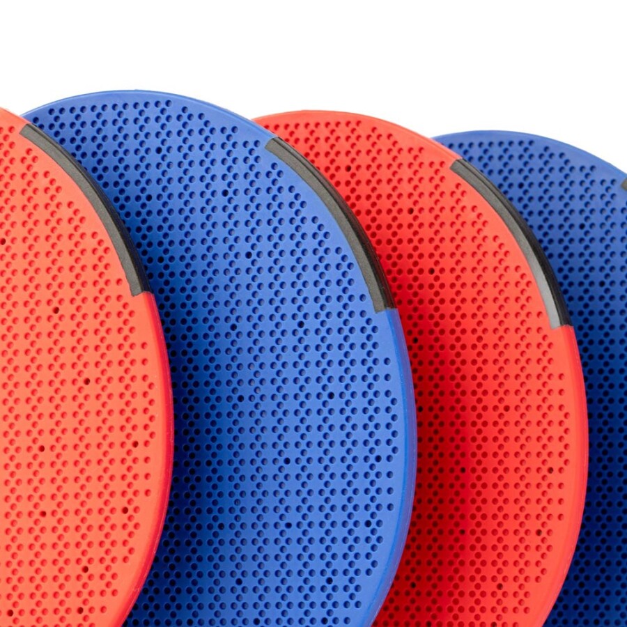 Dit kwartet batjes is klaar voor pauzes, gym of toernooitjes met de hele klas. De duurzame kunststof basis met rubber aan beide zijden levert grip, controle en veel speelplezier. Twee bats hebben een geribbelde voorkant in blauw, twee in rood; de achterzijde is glad. Ergonomische grepen zorgen voor zeker vasthouden door kinderen en volwassenen. Materialen zijn weerbestendig, dus je speelt zorgeloos buiten.