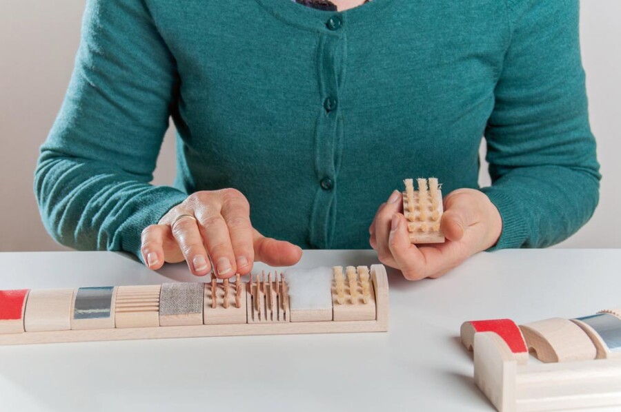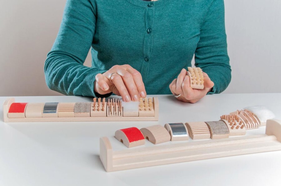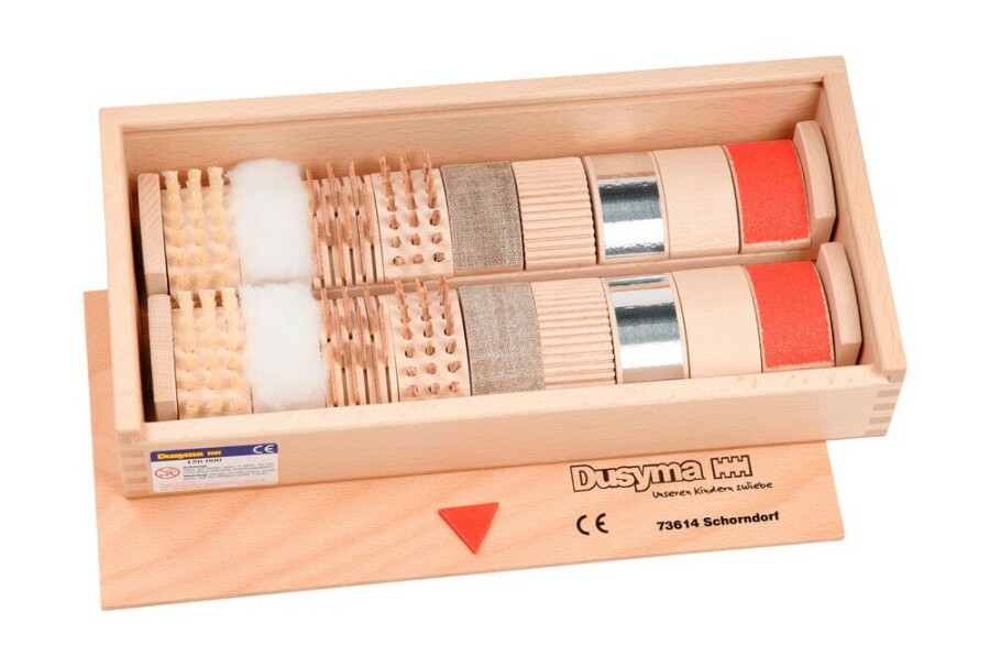 Met deze set oefenen kinderen zintuiglijk voelen en herkennen door verschillende materialen aan elkaar te strelen en met gesloten ogen te zoeken. Ze gebruiken voelstukjes om zacht aan te raken of om het juiste vakje op hun inlegbord te vinden. Elk inlegbord heeft negen materiaalstukjes met uiteenlopende texturen, waardoor je makkelijk variatie in opdrachten brengt. Denk aan grof linnen, aluminiumfolie, leer, borstelharen en schuurpapier. Het materiaal leent zich goed voor kleuters en jongere basisschoolleerlingen. Leerkrachten kunnen het tijdens kringactiviteiten of zintuiglessen inzetten. Ouders gebruiken het bij spelmomenten om woordenschat en aandachtsvaardigheden te stimuleren. De set bevat twee inlegborden en wordt geleverd in een houten kistje met schuifdeksel.