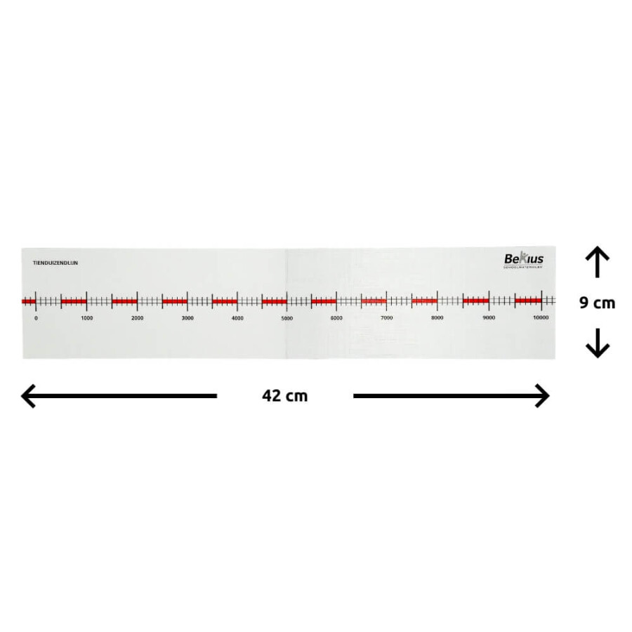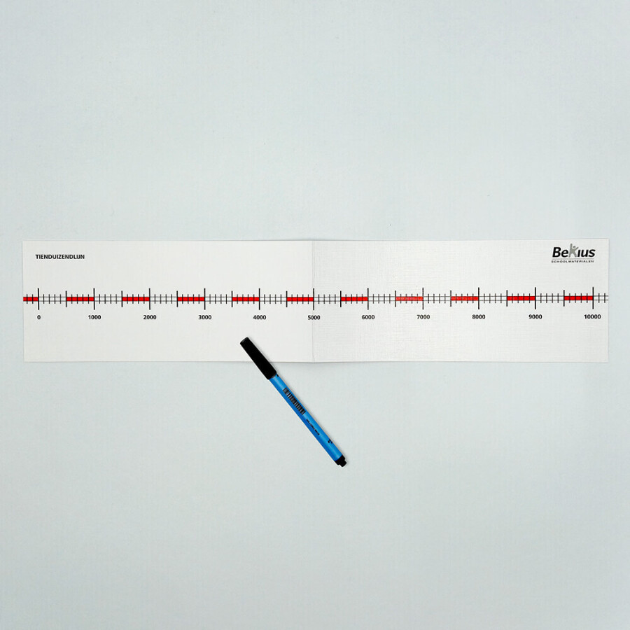Individuele getallenlijn van 0 - 10000 (5 exemplaren). Deze is te beschrijven met de uitwisbare stift. Deze gelamineerde getallenlijnen individueel zijn bij uitstek geschikt als remediërend materiaal, op de instructietafel, voor individueel gebruik en passen bij elke rekenmethode. De leerlingen kunnen op de getallenlijnen schrijven met de uitwisbare stift. Wanneer ze hun opdracht klaar hebben kunnen ze dit weer verwijderen met het poetsviltje wat op de dop zit. Zo zijn de getallenlijnen altijd weer te gebruiken.