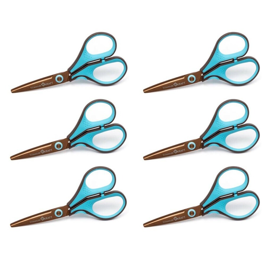 Deze set scharen snijdt papier, karton en stof moeiteloos. Titaniumcoating houdt de bladen lang scherp en roestvrij. Fijn voor klas en thuis, want je hebt meteen zes stuks. De ergonomische handgrepen liggen prettig in kleine en grote handen. Geschikt voor links- en rechtshandigen, dus iedereen kan ermee werken. Het 7 inch formaat biedt controle bij nauwkeurig knipwerk.