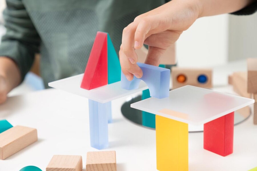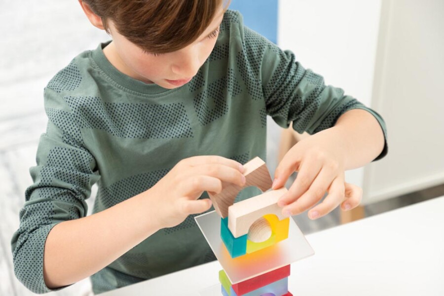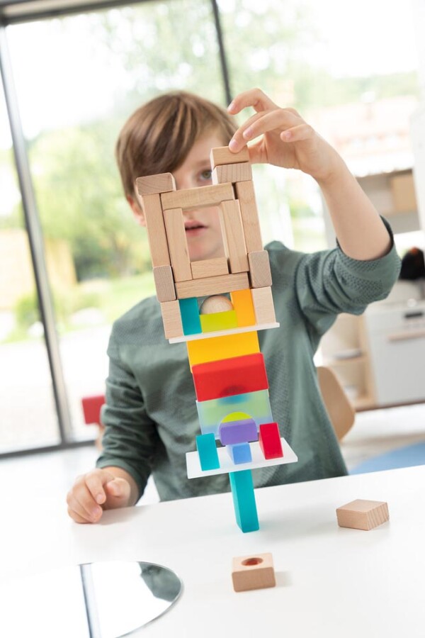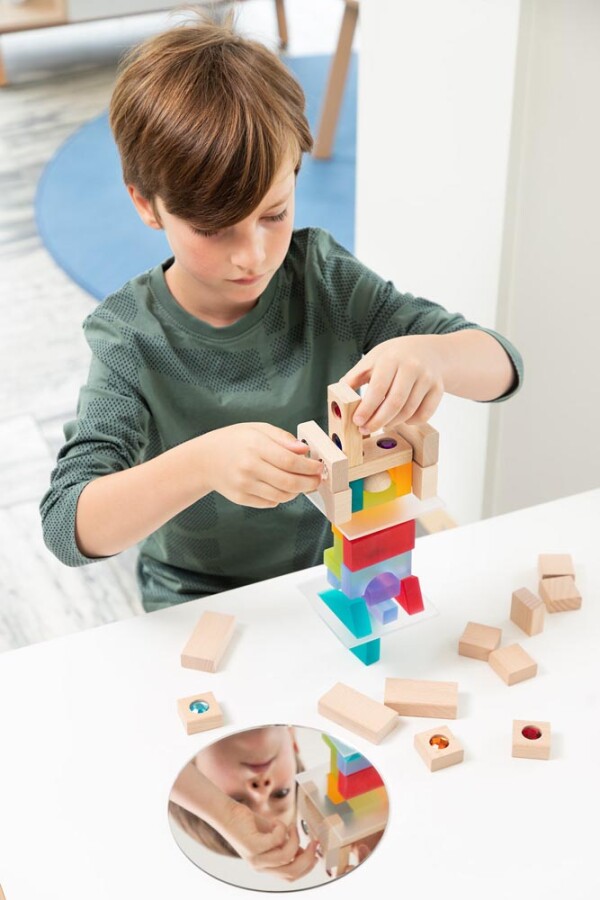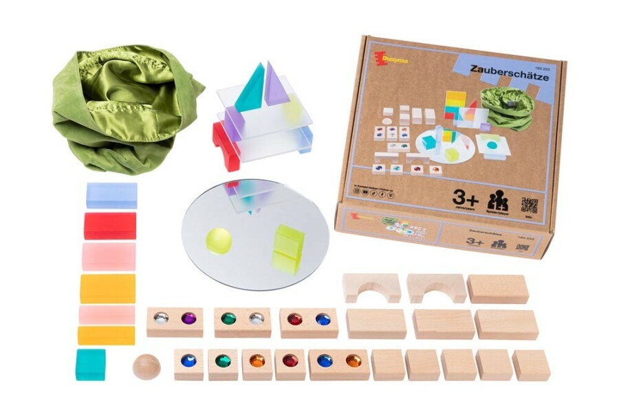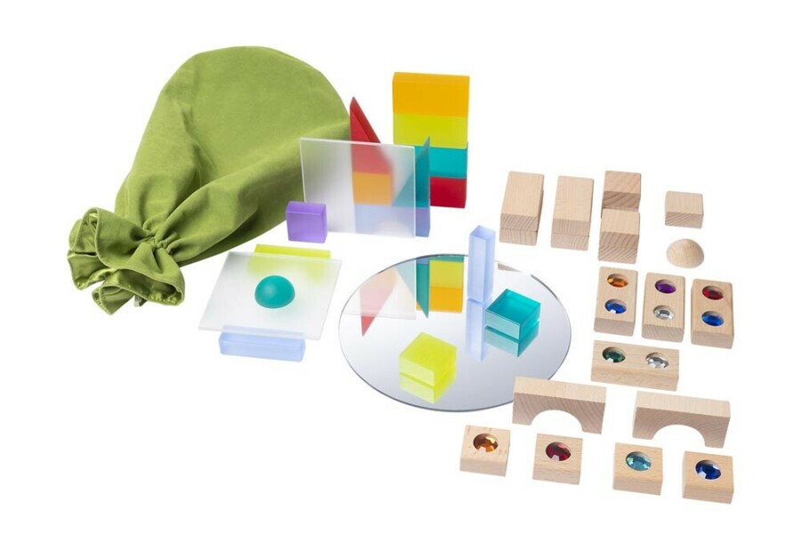 Een tas vol fonkelende bouwschatten voor licht-, spiegel- en fantasiespel. Kinderen stapelen, sorteren en experimenteren met reflecties en kleuren. Perfect voor bouwhoek, sensorisch spel en kleine onderzoekjes.