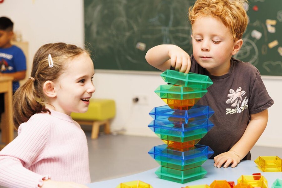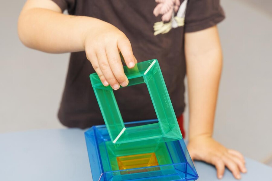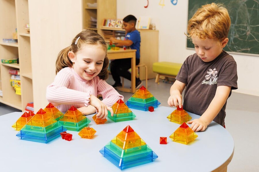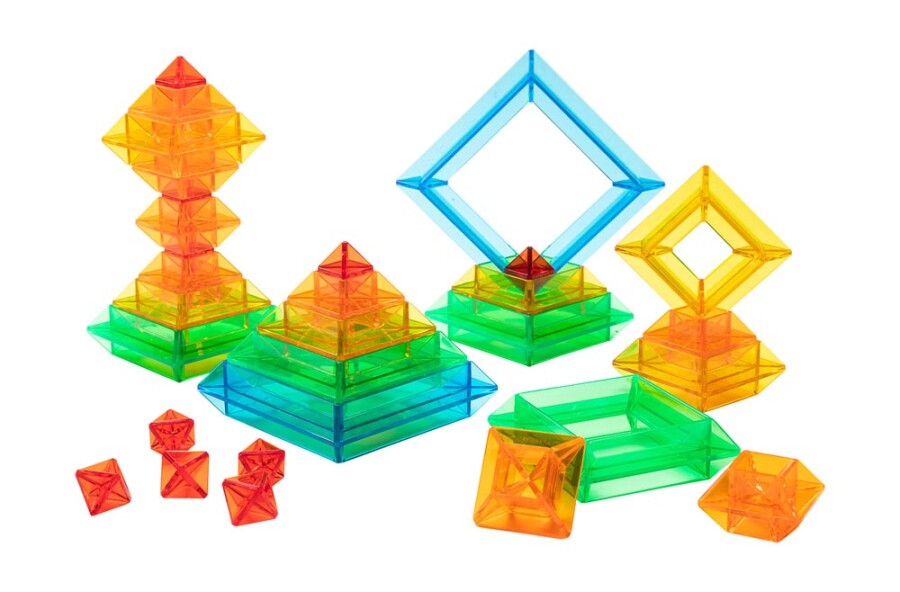 Met twee sets kunnen meerdere kinderen tegelijk bouwen en ideeën uitproberen. De transparante elementen stapelen in hoogte en vlak en mengen kleuren bij overlap. Ideaal voor de lichttafel en voor hoekwerk in de klas. Ondersteunt ruimtelijk denken, taal en samenwerken.
