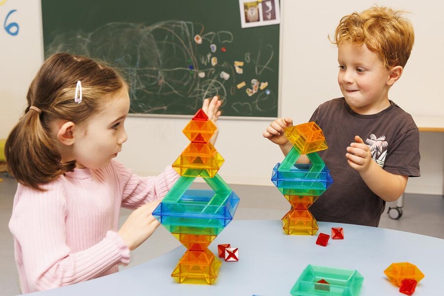 Klaspakket met zes sets voor meerdere groepjes tegelijk, inclusief stevige opbergbox. Transparante delen bouwen in hoogte en vlak en laten kleuren samensmelten. Perfect voor atelierrondes, vrij spel en constructieopdrachten. Werkt extra mooi op een lichttafel.