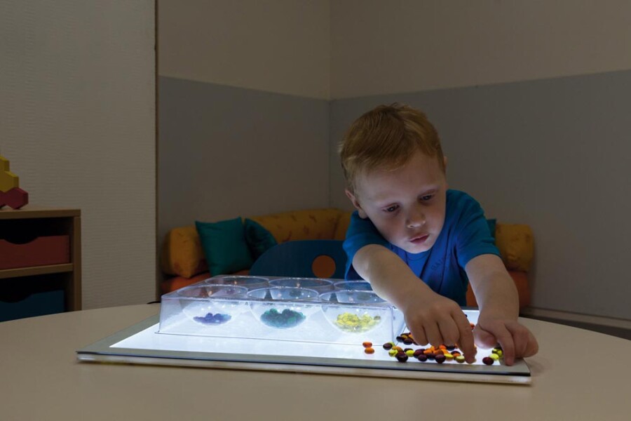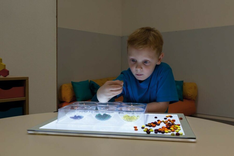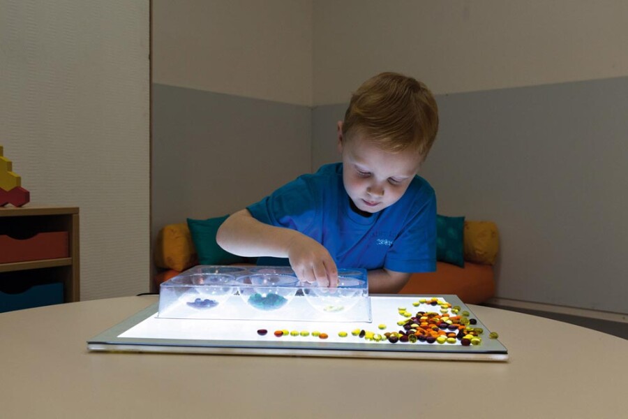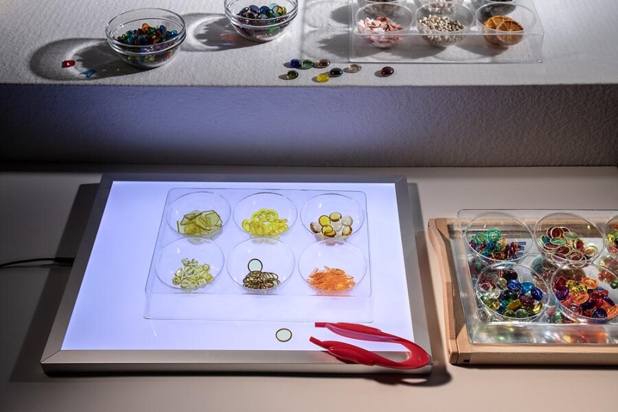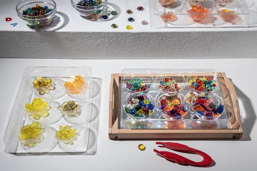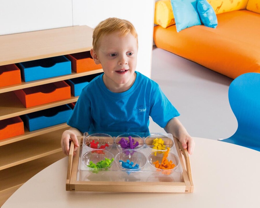 Met deze transparante schaal sorteren kinderen kralen, knopen en andere kleine materialen overzichtelijk. De zes ronde kuipjes houden alles gescheiden, ook op een lichttafel. Het doorzichtige materiaal laat kleuren en licht mooi door. Handig te combineren met een dienblad met transparante bodem.