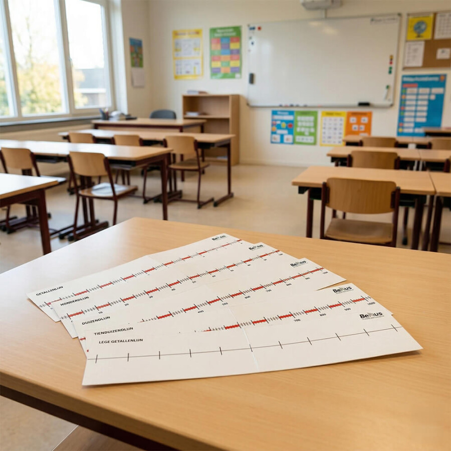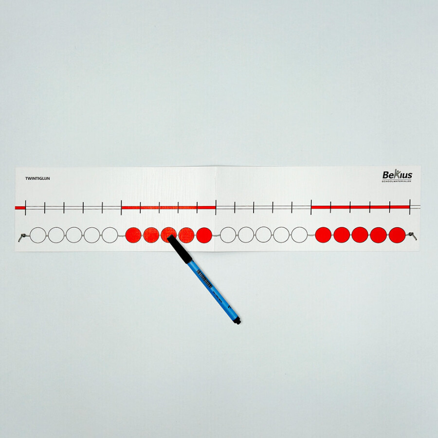 Individuele getallenlijn van 0 - 20 (5 exemplaren). Deze is te beschrijven met de uitwisbare stift. Deze gelamineerde getallenlijnen individueel zijn bij uitstek geschikt als remediërend materiaal, op de instructietafel, voor individueel gebruik en passen bij elke rekenmethode. De leerlingen kunnen op de getallenlijnen schrijven met de uitwisbare stift. Wanneer ze hun opdracht klaar hebben kunnen ze dit weer verwijderen met het poetsviltje wat op de dop zit. Zo zijn de getallenlijnen altijd weer te gebruiken.