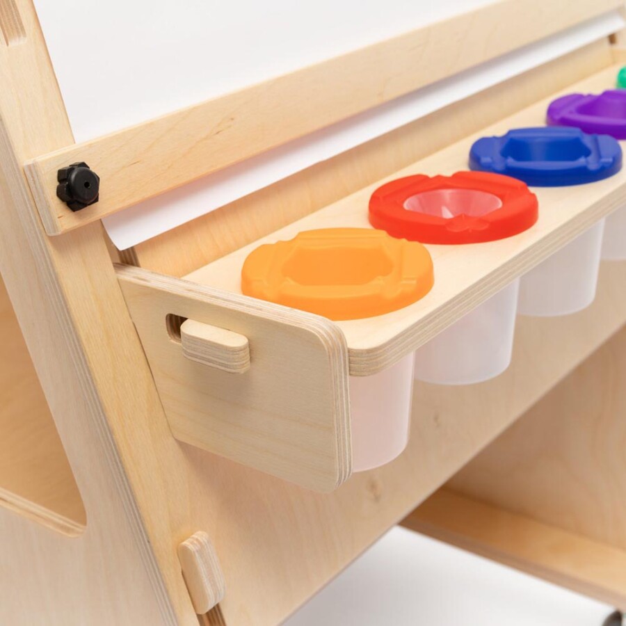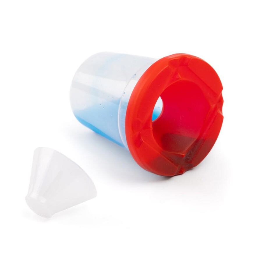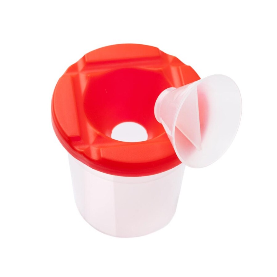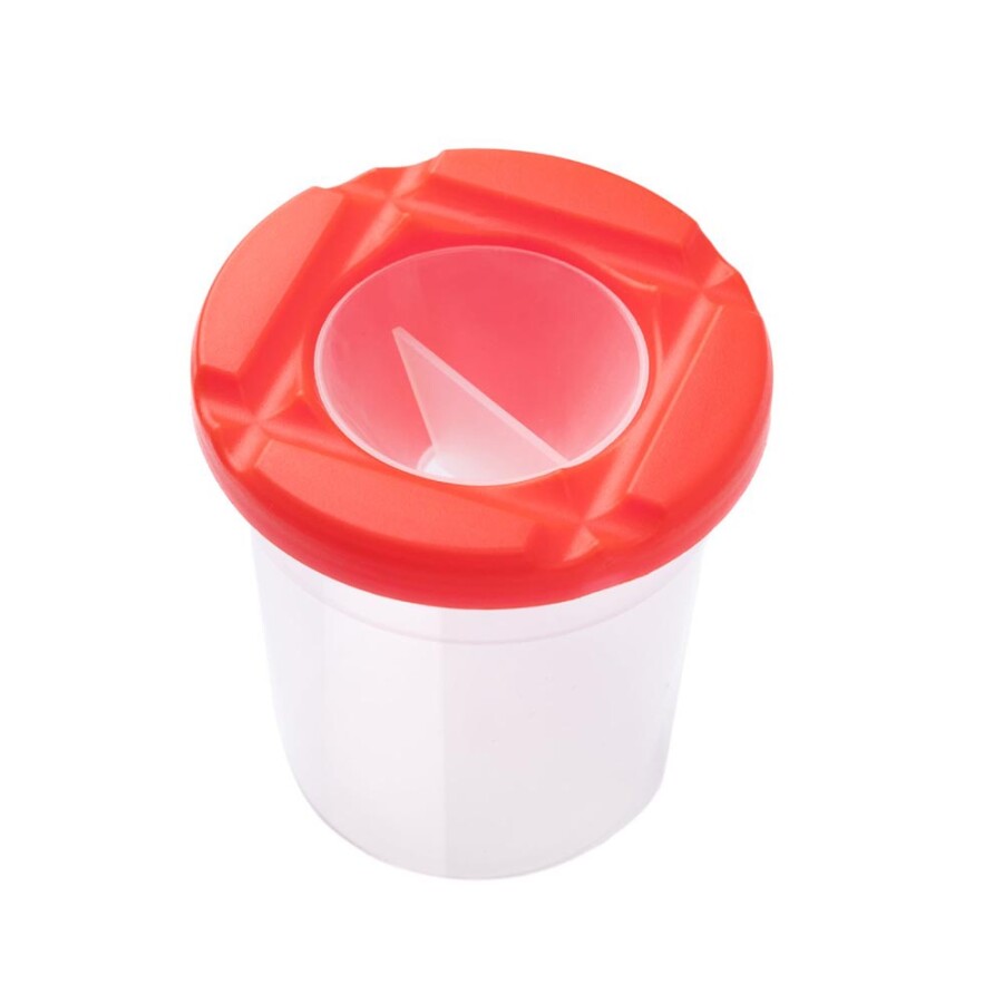 Geen tranen meer bij omgevallen verfbekers; deze blijven dicht en het werk kan door. De speciale trechterdeksel blokkeert verf, zelfs als de beker kantelt. Met de inzet sluit je de beker luchtdicht af en blijven kleuren vers. De trechterrand houdt de kwast vast en laat overtollige verf makkelijk afstrijken. Ideaal voor klas en opvang, in zes heldere kleuren.