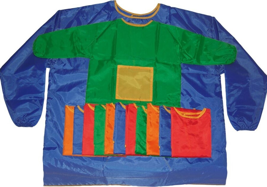 Voor verf en knutselen zonder geknoei beschermt deze set kleding in klas en thuis. Je krijgt twaalf kinderschorten in maat 98–110 en één voor een volwassene. De schorten sluiten achter met klittenband en hebben elastiek in de mouwen. Gemaakt van glad polyester dat je zo weer schoonveegt.