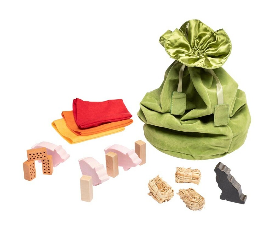 Herbeleef het verhaal van drie varkentjes met stevige houten figuren en bouwmaterialen. Kinderen onderzoeken bouwen, oorzaak-gevolg en rolspel. Laat ze huizen vergelijken: stro, hout en steen, en oplossingen bedenken. Ideaal voor taal, samenwerken en plannen. Kleine onderdelen vragen toezicht van een volwassene. De fluwelen buidel bewaart alle onderdelen overzichtelijk.