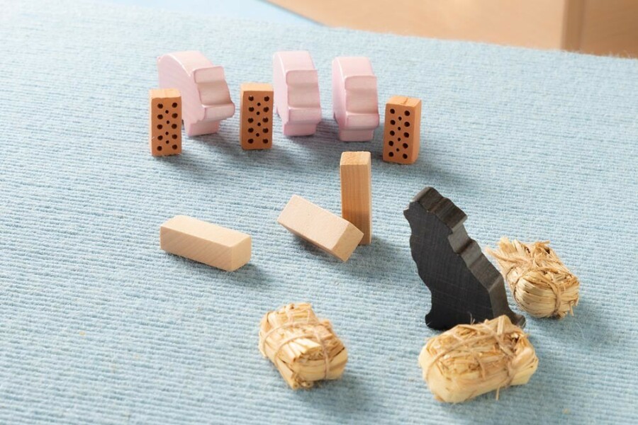 - Inhoud: 3 varkentjes, wolf, 3 strobalen, 3 balken, 3 stenen, 3 huiszakjes
