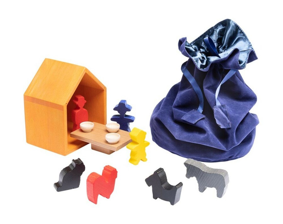 Met deze verhalenbuidel spelen kinderen het bekende verhaal van de stadsmuzikanten na. De houten figuren nodigen uit tot taal, samenspel en eigen wendingen. Ideaal voor kring, taalhoek of individuele ondersteuning. Laat kinderen gevoelens benoemen en nieuwe woorden oefenen. Kleine onderdelen blijven onder begeleiding van de volwassene. De fluwelen zak houdt alles netjes bij elkaar.