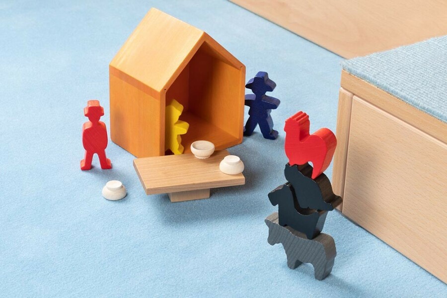 - Inhoud: ezel, hond, kat, haan, huis, 3 rovers, tafel, 3 schaaltjes