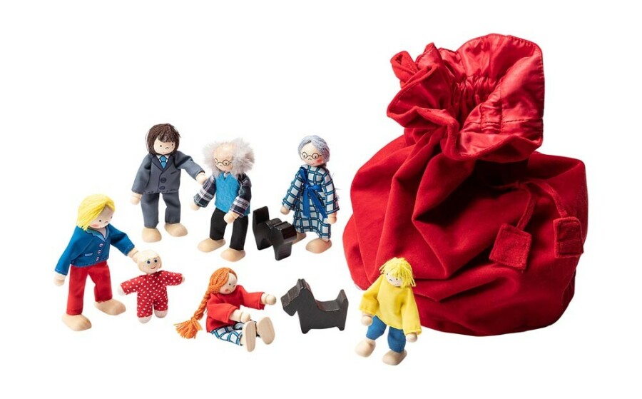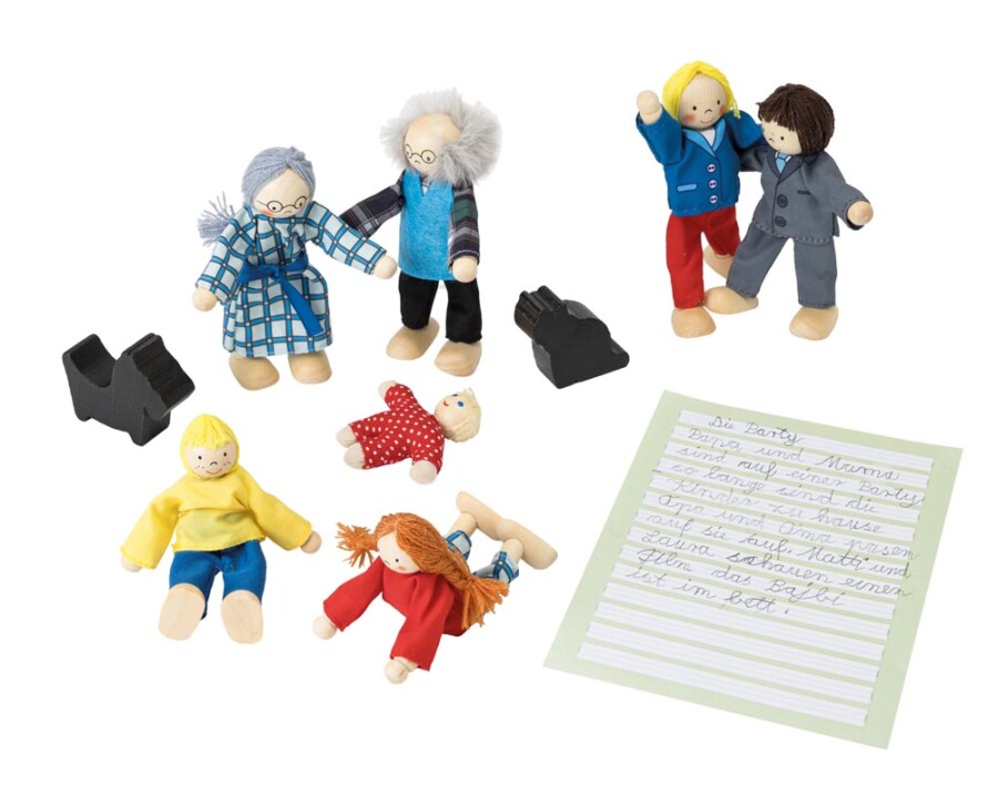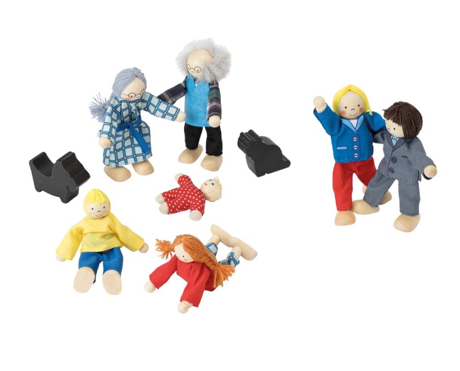 - Inhoud: houten figuren (moeder, vader, oma, opa, dochter, zoon, baby), hond en kat.